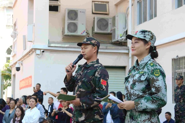 伴随着激昂的进行曲,三军战队的新兵和老兵们迈着铿锵有力的步伐登场。三军集结后,在嘹亮的国歌声中,护旗队将国旗冉冉升起,全体新兵、老兵、教职工们举起右手,在国旗下庄严宣誓。担任军事总指挥的程蓉园长深情的致辞掀开了本次演习活动的序幕。