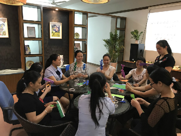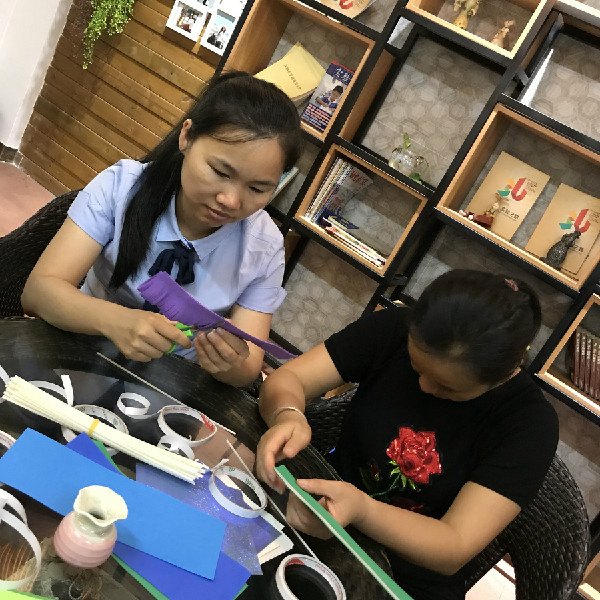 礼轻情意重,老师们围坐在一起,利用一些环保材料,你剪我撕她粘贴,一起为妈妈制作小礼物。