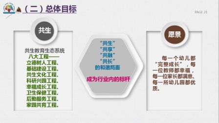 接着,刘主任提出了未来五年发展的主题词——持续普惠发展,打造共生品牌,发展核心理念——共生、共享、共融、共长,以及“打造八大主体工程,协调推进‘共生’教育生态系统,形成实验幼教中心独有的‘共生’品牌,成为行业内标杆”的总体目标。并对“基础建设工程、共生文化工程、立德树人工程、科研兴园工程、幸福成长工程、卫生保健工程、后勤服务工程、家园共育工程”等八大工程的工程意义、重点任务及推进举措进行了详细说明,让幼教中心五年发展规划方向明确、任务清晰、针对性强、切实可行,获得了全体教工的高度认同。