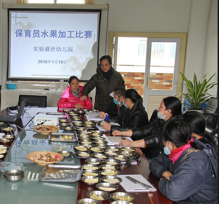 金鸡鸣唱和谐曲,玉犬奋进铺新迹。为不断提升保育和后勤职工职业技能水平,提高服务质量,增强服务意识和责任意识,2018新年伊始,实验盛世幼儿园组织开展后勤、保育员岗位练兵,圆满地完成了保育员“切水果比赛”和食堂厨师“舌尖上的美食”两项岗位练兵活动。