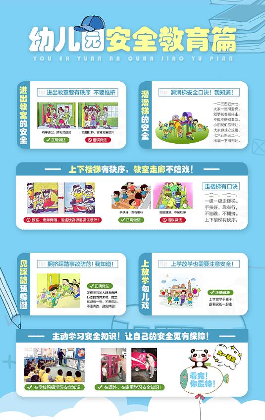 开学的第二周是幼儿园的安全教育周。安全教育活动的组织丰富多彩,师生家长参与度高,亮点不少。值得一提的,一是全园教师和幼儿,在福田区学校安全教育平台上,学习并完成课后作业,教师授课率和幼儿作业完成率均达100%,区排名榜上有名;二是全园10个班级将幼儿要掌握的基本安全常识,选择不同的安全教育主题(交通、防拐、食品、防溺水、自然灾害等)开展教育活动,并设计出安全教育宣传海报,全园共享,积累园本安全教育资料的同时,张贴在社区宣传。