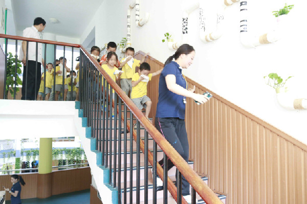 为进一步增强我园师生消防安全意识,提高防范自救能力,9月19日,深圳实验新亚洲幼儿园联合紫薇消防站举行了消防逃生演练,本次消防演练模拟着火点是三楼教师办公室。下午三点三十分,演练开始,教师办公室的三位老师按照分工:拉电闸、灭火、报警、大声呼喊通知撤离,各班老师选择就近安全路线,有序的带领孩子们跑到安全区域,后勤人员到各通道进行疏散,消防员救助被困教师,整个过程用时两分四十五秒。