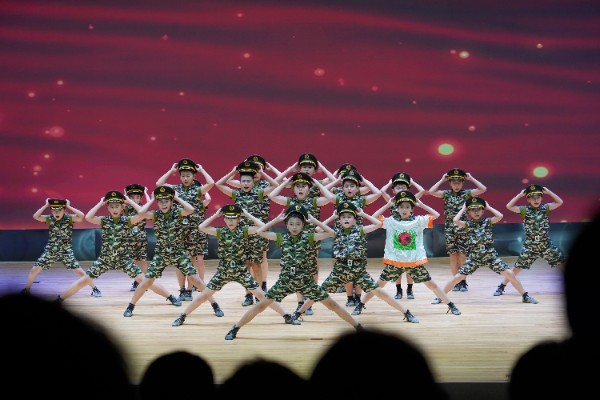 首先登台的是坂田校区选送的学生舞蹈《我也想当兵》,实验少年身着迷彩,步履矫健,他们托举红旗,象征着实验师生应有努力成为中华民族脊梁的价值追求。