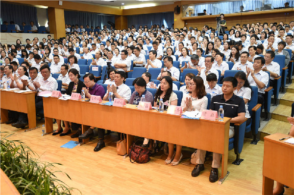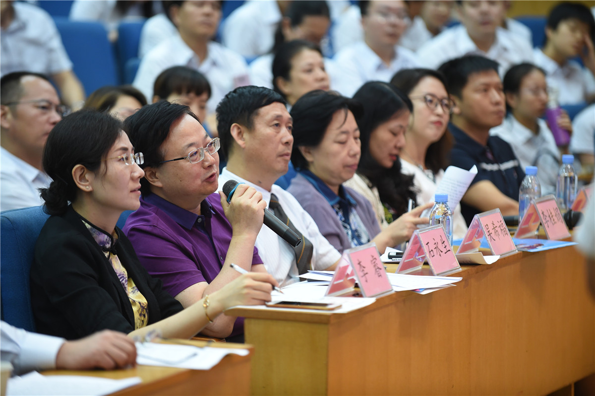 7月11日下午,深圳实验学校2018“年度教师”评选大会在中学部小礼堂隆重举行。学校领导、各部专职教师参加大会,共同期待并见证了“年度教师”产生的过程。来自各部的“年度教师”候选人闪亮登场,分别是坂田部的李虹老师、小学部的袁圆老师、初中部的胡晓江老师、中学部的潘浩老师和高中部的徐怡华老师。他们将参加三个环节的现场比拼,由七位专业评委现场打分,最后综合个人业绩材料、小组讨论和演讲与答辩三项的评分,评选出深圳实验学校2018“年度教师”。大会由中学部杨宁、熊珊老师主持。