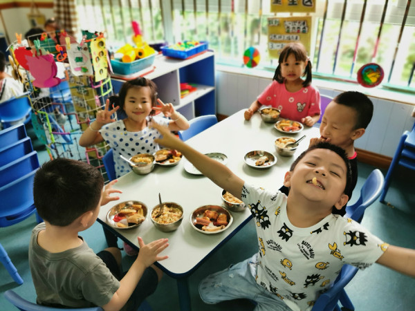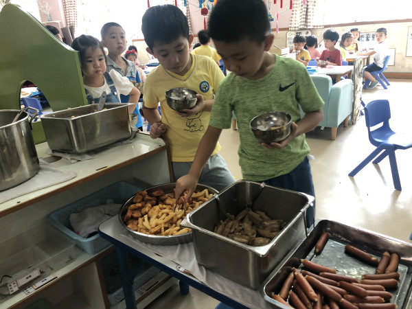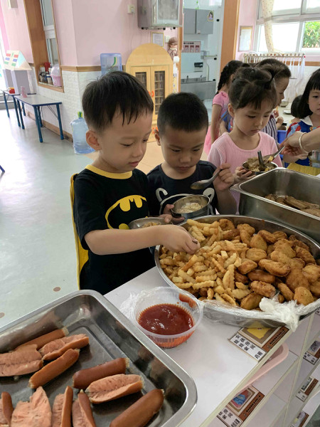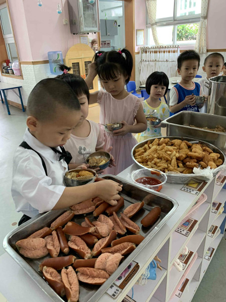 快乐的日子里,一定少不了美食的陪伴。班级老师提前和孩子们商讨自助餐的菜品,孩子们还动手设计了菜单,最后幼儿园根据孩子的喜好,准备了丰盛的自助午餐:火腿肠、麦乐鸡块、卤鸡翅、薯条、卤排骨、排骨苦瓜汤、五彩饭,孩子们根据自己的喜爱来选择美食,个个脸上绽放着灿烂的笑容,不仅学会了等待、谦让,养成了文明用餐的好习惯,同时也体验了自助午餐的自主和乐趣。