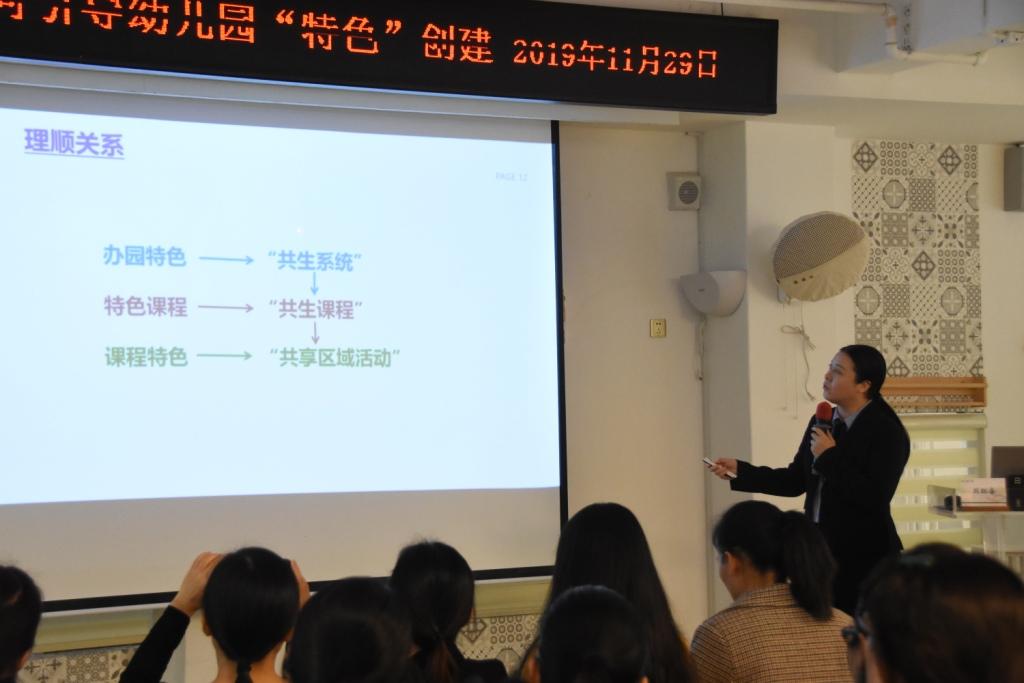 接着,刘红喜主任以实验教育集团幼教中心的“共生生态系统、共生课程和共享区域活动”为例展开阐述,帮助大家厘清办园特色、特色课程、课程特色的概念及它们之间的层次与关系。她提出:“共享区域活动”是在不断完善园本课程研究的过程中逐步生成的一种区域活动特色实施模式,它的创建和发展要经历几个阶段,每个阶段的创新性研究都是推进园本课程发展的重要经历。而“共生课程”是在课程改革和研究中,从“完整课程”发展而来的园本课程,既体现了传承和创新的科学发展观,又体现了“以儿童为本”的思想,并在研究中逐渐建构出课程框架体系和课程的品牌亮点,形成了深圳实验幼教中心独有的特色课程。