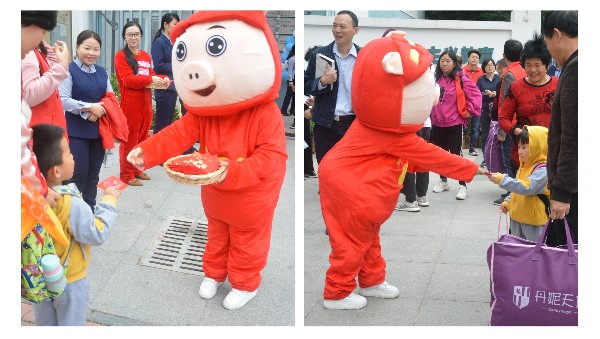 今天是正月十四,明天就是元宵节,都说没过十五就是年。家委们变身吉祥物早早的在幼儿园门口等待孩子们的到来,收到了吉祥物——“金猪”派发的的利是,意味着孩子们在园精彩的生活也就开始咯!