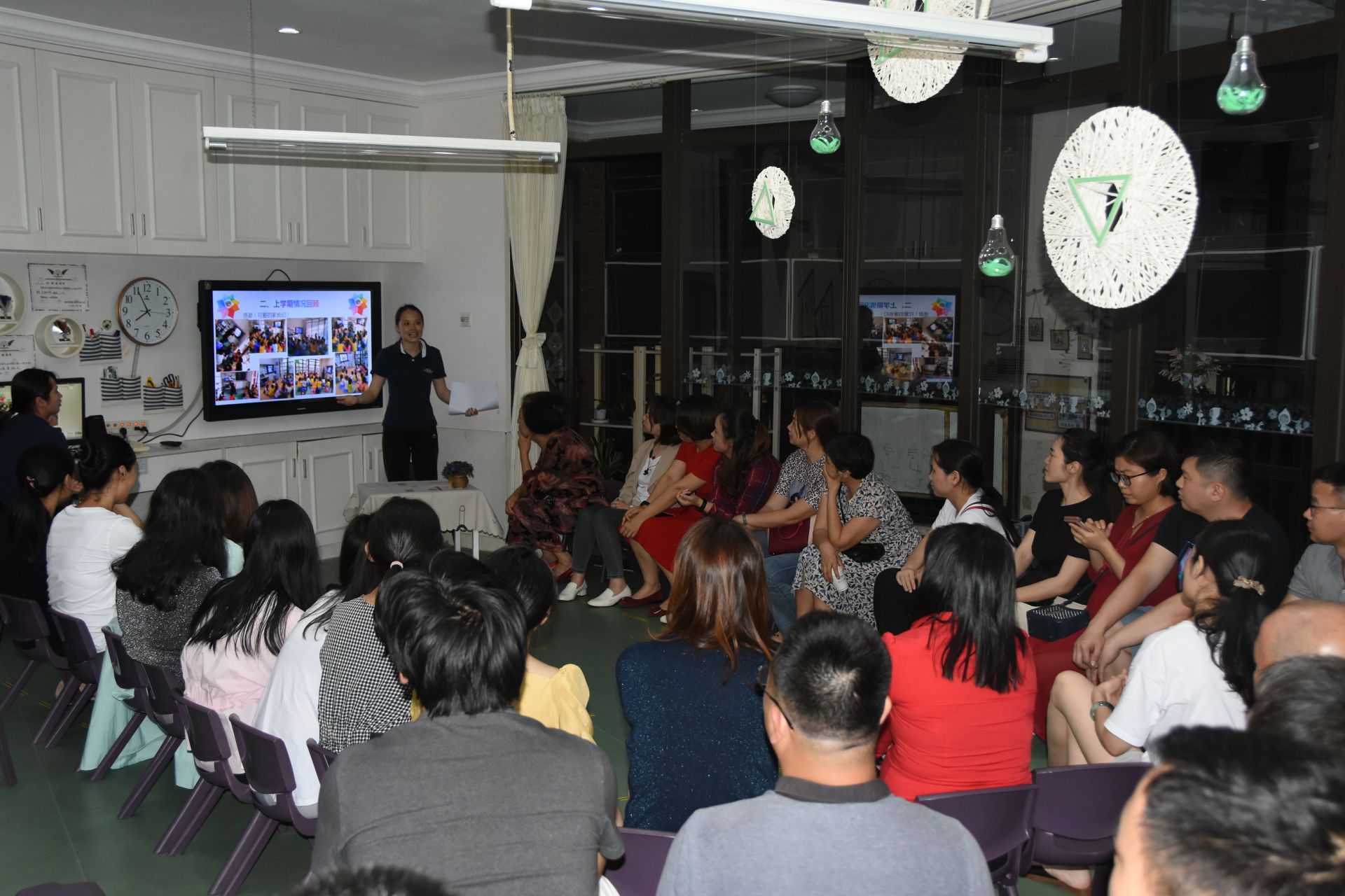 集中分享后,分班家长会上,老师们就幼儿园的课程设置、重大活动、幼儿安全及家园配合等相关事宜与家长们进行了近距离的交流,并针对本班孩子的特点及共性问题与家长进行了互动与探讨。