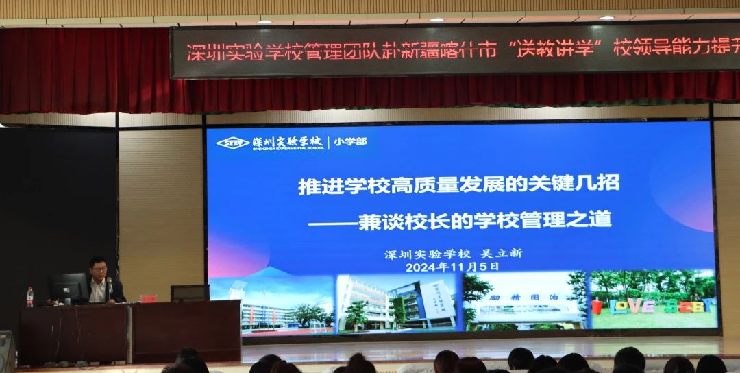 吴立新副校长为喀什市近300多位校领导带来专题培训《推进学校高质量发展的关键几招——兼谈校长的学校管理之道》,阐述了学校文化管理之道,分享了深圳实验学校的教育实践和管理经验,强调了“党建引领,文化润心,课程启智,制度规范”的重要性。参会者们表示深受启发,对办校治学有了新的认识。