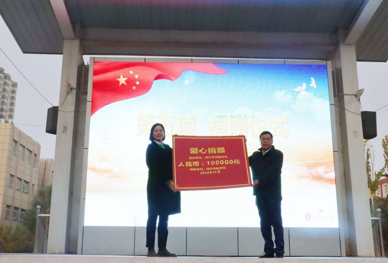在喀什市实验学校升旗仪式上,举行了温情的捐赠仪式。深圳援疆前方指挥部陈益清副处长、喀什市实验学校杨雁书记与4600余名师生共同见证了这一富有意义的时刻。深圳实验学校副校长吴立新代表深圳实验教育集团,将十万元捐赠给喀什市实验学校,用于支持学校教育资源的建设和发展。这笔捐赠象征着深圳和喀什之间坚固的教育纽带,传递出两地教育人携手共进的深厚情谊。