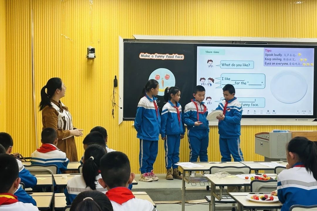 赵婷老师则展示了一节精彩的英语课《Make a funny food face》,以其独特的创意和精心的设计,为孩子们打造了一个充满欢笑与探索的学习乐园,展现了“英语学习活动观”的非凡魅力。小组展示时,孩子们满脸自豪地介绍自己的食物脸谱作品,老师们也被其学习热情和创造力所感染,纷纷赞叹这样的教学不仅让学生们学有所获,更激发了大家探索更多创新教学方法的热情。