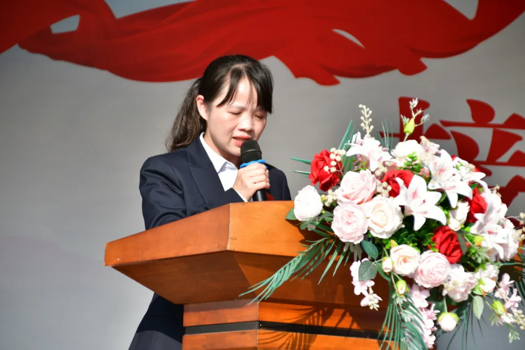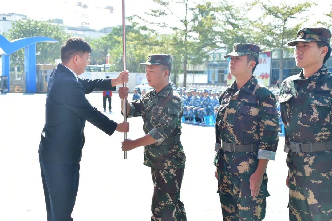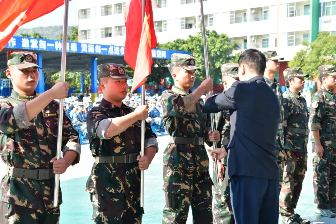 周养平副校长依次向教官授予连旗,红色的旗帜在阳光下不断传递,如同爱国的火种在同学们心中代代相传。全场师生目光紧紧追随着连旗,掌声与欢呼声此起彼伏,热烈的氛围将开训仪式推向高潮。