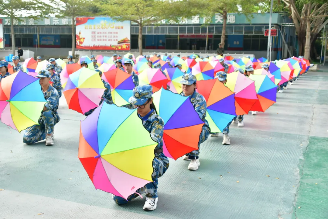“彩虹伞方队” 的登场让现场气氛更加热烈。巨大的彩虹伞在同学们的手中缓缓展开,红、橙、黄、绿、青、蓝、紫七种颜色交织在一起,宛如一道绚丽的彩虹降临操场。同学们随着音乐的节奏,挥舞着彩虹伞,时而高高举起,形成一片彩色的海洋。