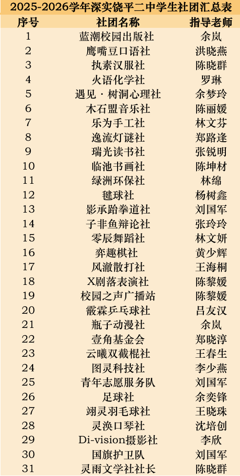 深圳实验饶平二中团委现有学生社团31个:Division摄影社、风澈散打社、国旗班、火语化学社、毽球社、蓝潮校园出版社、乐为手工社、零辰舞蹈社、灵涣口琴社、灵雨文学社、绿洲环保社、木石盟音乐社、霰霖乒乓球社、瓶子动漫社、青年志愿者服务队、瑞光读书社、临池书画社、图灵科技社、剧落表演社、校园之声广播站、遇见.树洞心理社、翊灵羽毛球社、逸流灯谜社、壹角基金社、影承跆拳道社、弈趣棋社、云曦双截棍社、执素汉服社、子非鱼辩论社、足球社等。积极健康向上的社团活动为学生自我发展提供平台,让学生在学习之外发展自己的一技之长。多彩的社团活动,丰富了校园生活;浓浓的文化氛围,助力学生成长。