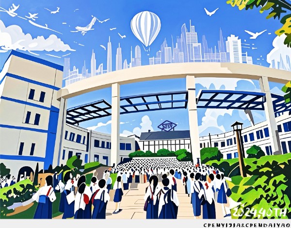 陈奕佳、陈黛尧同学是一对校友伉俪,双双博士毕业。得知母校四十周年校庆在即,十分高兴,并与当年的班主任傅芳觉老师取得联系,随即创作了《深圳实验学校四十周年校庆创作》。作者以数字版画的形式,创作了一幅校庆四十年的画稿,其创作理念是在深圳实验学校高中部标志性大门建筑的基础上,于蓝白色彩搭配的主题色背景里,增添了以细线缠绕勾勒的世界各地知名建筑,以及象征梦想与自由的热气球、和平鸽、飞机等图形元素,下方的学生们身着咱们标志性的普蓝白配色实验校服,展现实验学子通往世界大舞台的梦想从母校出发的概念。