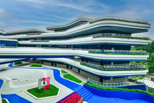 ——蓝白相间、绿植环绕、自然灵动的空间设计,朗朗书声、浓浓书香,描绘出初中部校园勃勃生机的美丽画卷。