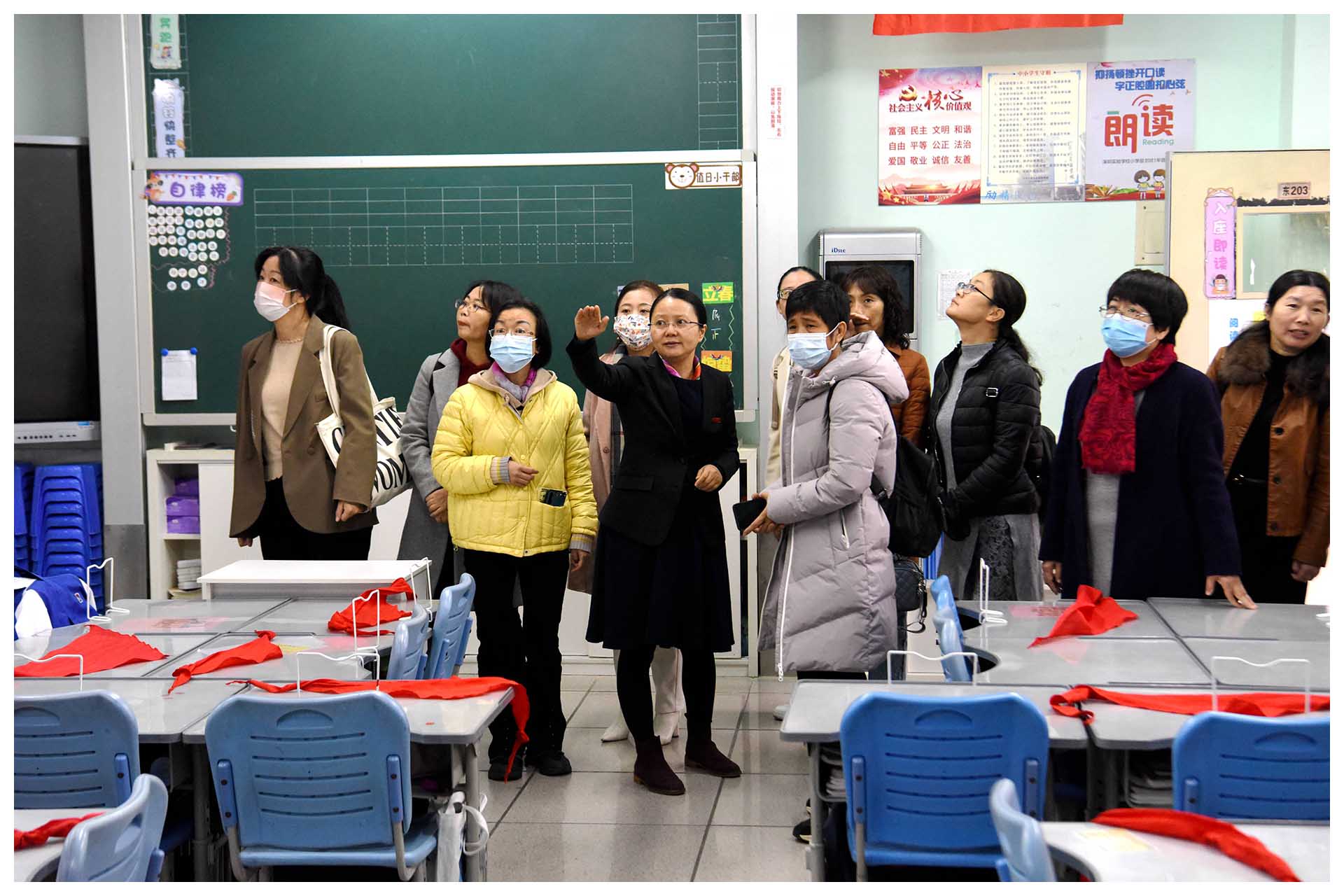接下来是班级文化建设和课间操观摩。小学部学生处杜益明、龚红芳两位主任带领南澳的领导老师们参观了二、三年级各班教室,每班悬挂的班徽、班旗各具特色,班训、口号各有内涵,教室里的文化墙、板报、图书角等都充分展示了孩子们的创意和才华。课间操上,孩子们精神饱满,动作有力,来宾们对小学部的班级文化建设和孩子们课间操的精神风貌给予了高度评价。