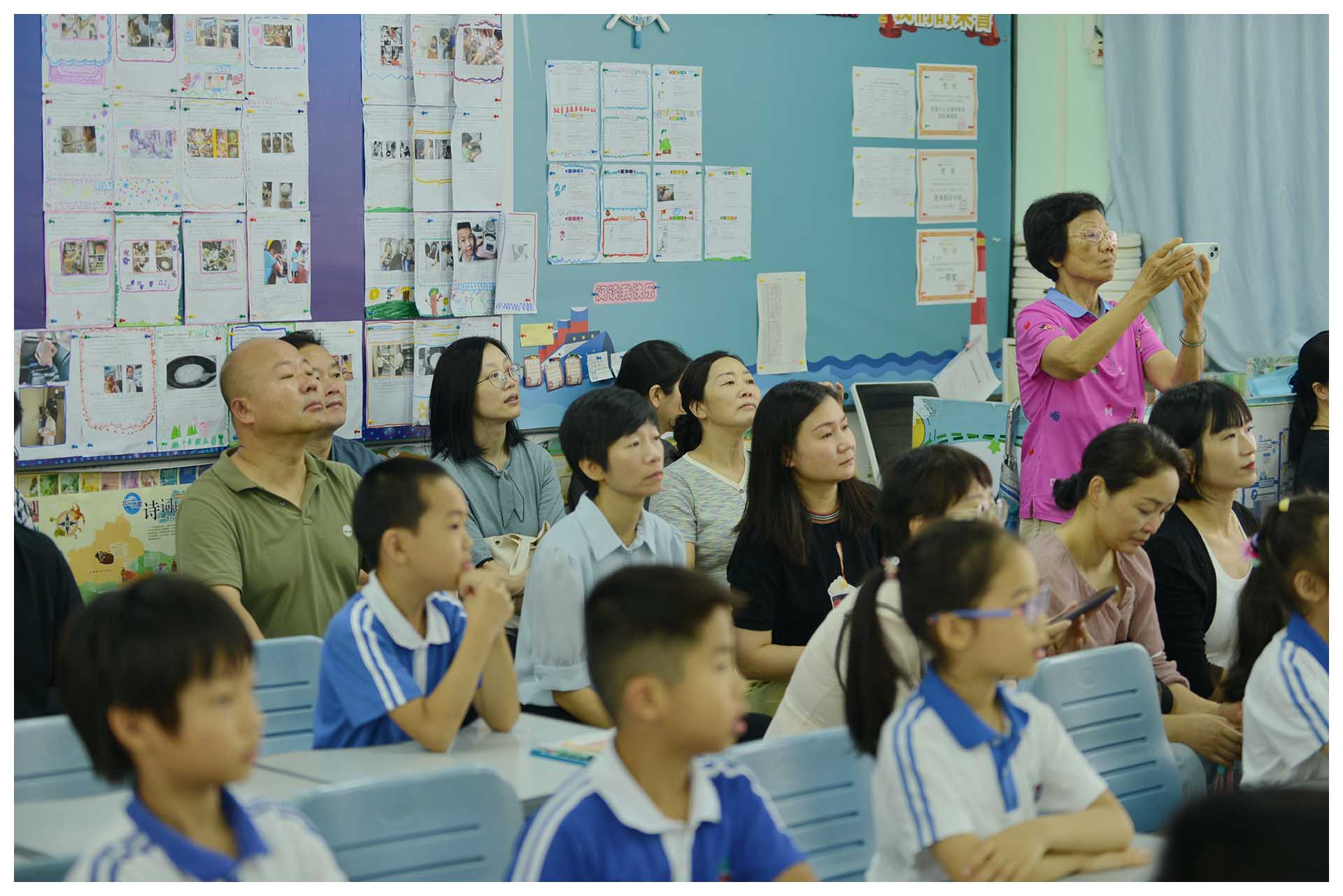 这个念想很快就会实现。在语文老师组织同学们与家长进行诗词背诵PK时,孩子们纷纷面向家长大声喊道:“爸爸,你也来背吧!”“妈妈,快举手!”原本只是兴致勃勃地看着孩子背诵的老爸老妈,也因此亲自下场。一场同学之间的切磋,悄然转换成亲子之间的游戏。