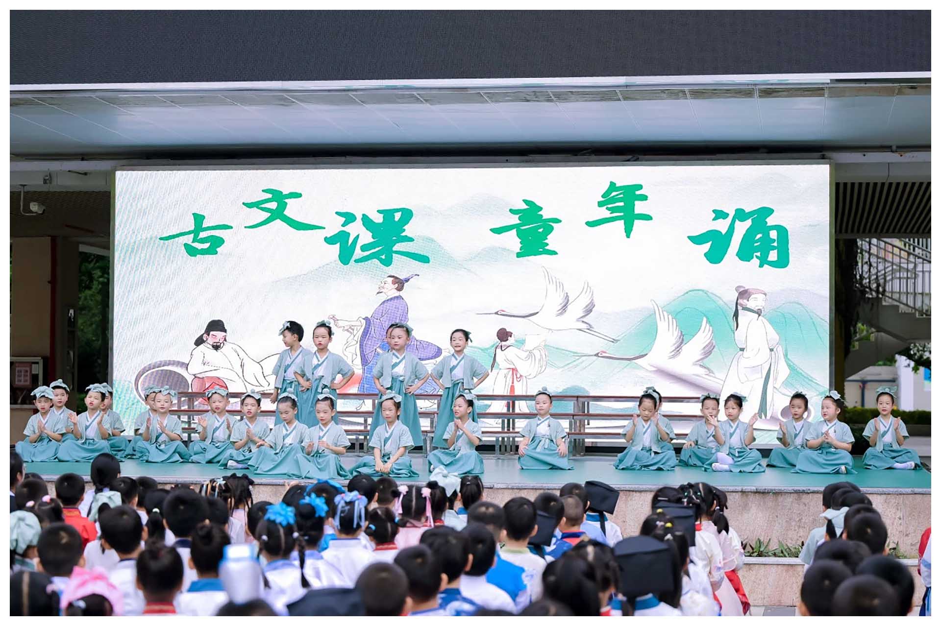 “八月秋高风怒号,卷我屋上三重茅。茅飞渡江洒江郊,高者挂罥长林梢,下者飘转沉塘坳。南村群童欺我老无力,忍能对面为盗贼……”在古诗文的诵读声里,家长根据地面指引,很容易找到孩子的教室。当你静静地端坐在教室后排或一侧的小圆凳上,看着孩子们高声诵读古典诗文,似乎穿越到了自己的读书时代,正在摇头晃脑地背诵古诗。