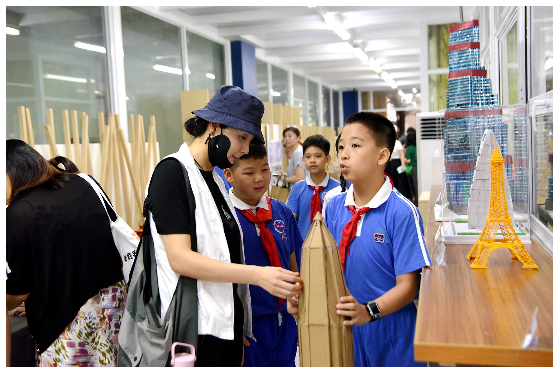 在掌声里,在欢笑声中,前行几步,就是微展馆,里面陈列着本学期数学周搭建的模型以及微创新作品,别担心自己看不懂,他们的创造者会为你一一讲述作品的原理和背后的故事……