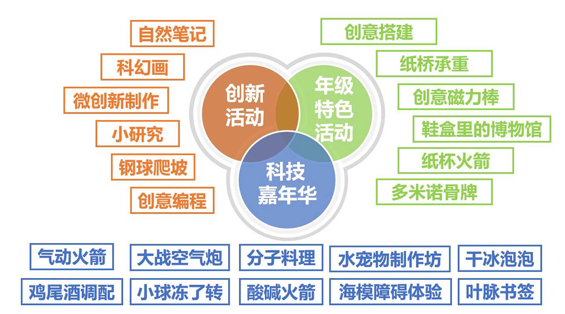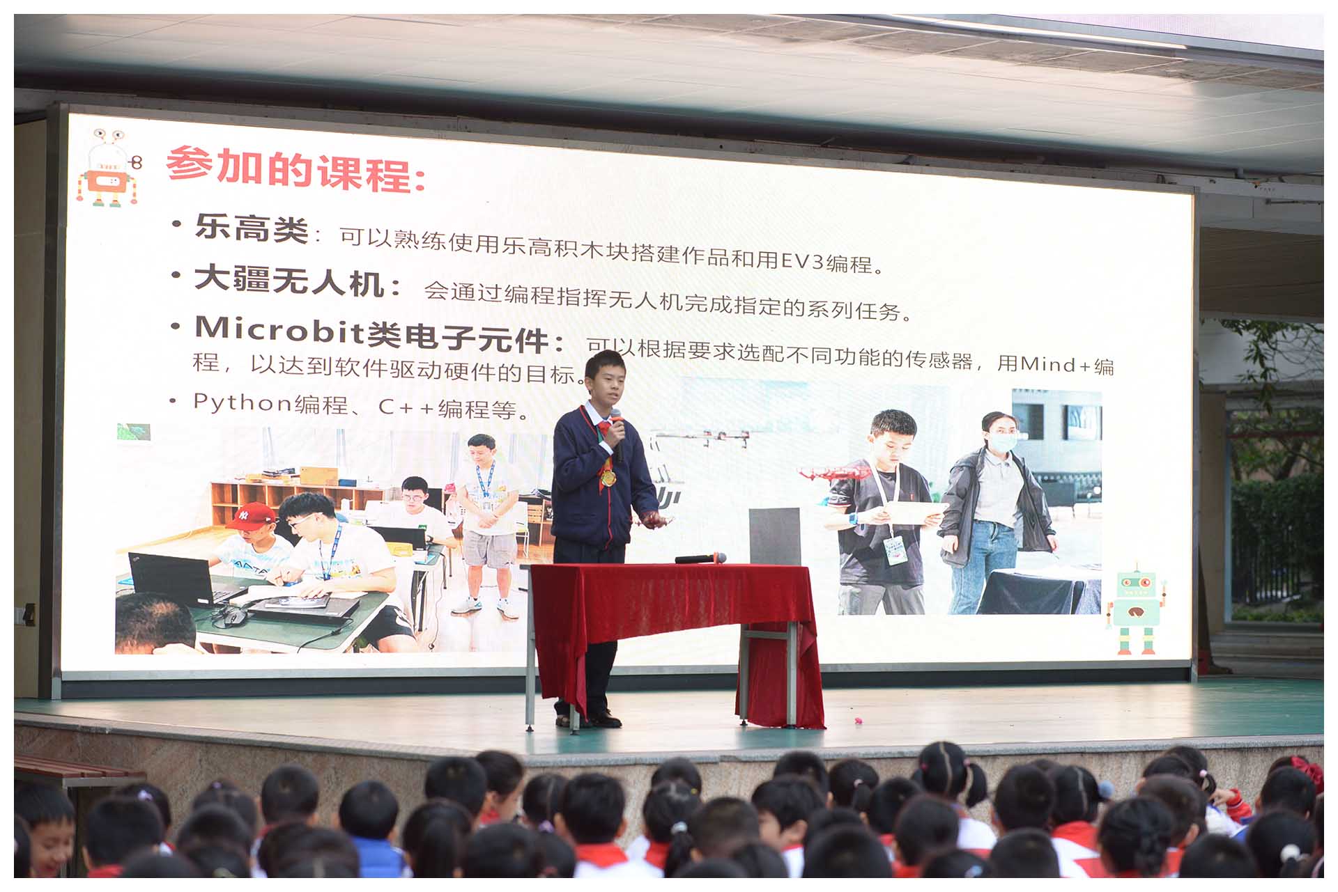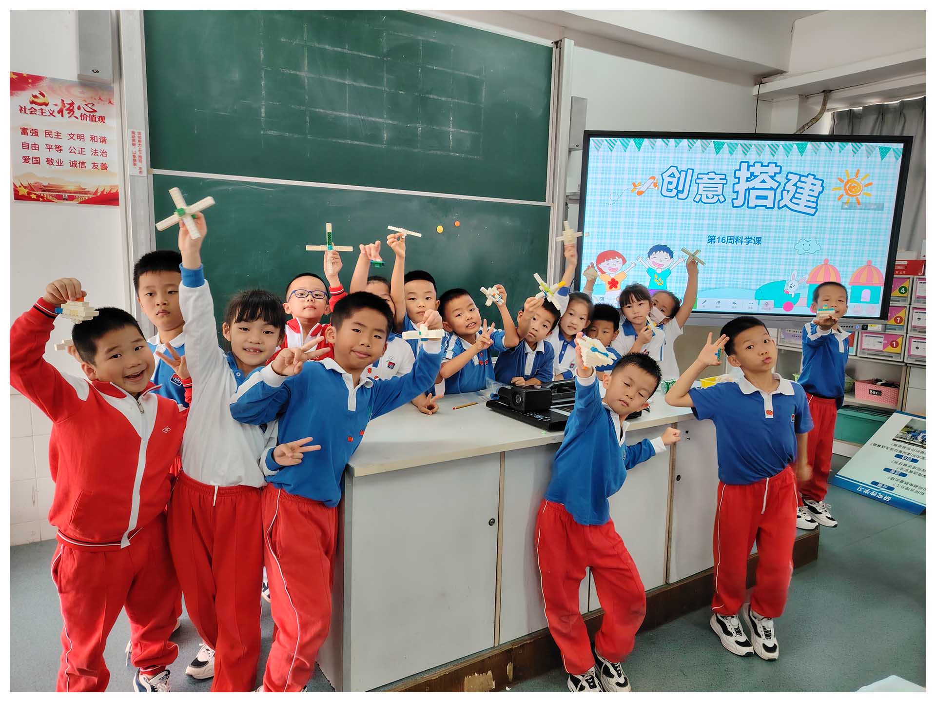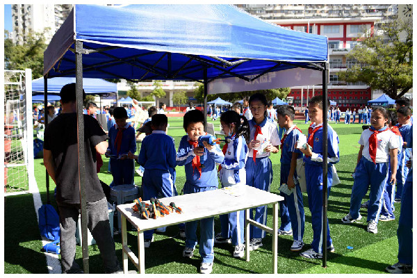 一年级 “创意搭建”活动,学生搭建了创意楼梯,还制作了可以持久旋转的创意积木陀螺;二年级“纸桥承重”活动,学生做的纸桥力气可大了;三年级“磁力棒造房子”活动,学生充分发挥想象力,设计制作了精美的“磁力棒房子”;四年级“鞋盒里的博物馆”活动,小小的鞋盒变成一个个精致又有趣的“博物馆”,既有科技感满满的核能博物馆,也有吃货天堂广东粤菜博物馆,应有尽有;五年级“纸杯火箭赛”活动,学生动手动脑,应用科学原理制作出飞得更高更远的“火箭”,同学们还创做出多级火箭、撒花火箭、八爪鱼火箭等等新型火箭;六年级“多米诺骨牌”活动,考验学生的专注力、耐力和创造力,各种好玩又精美的多米诺骨牌设计让人眼前一亮。年级特色活动,全员参与,每个学生都发挥想象力和创造力,沉浸在设计与制作的乐趣之中。