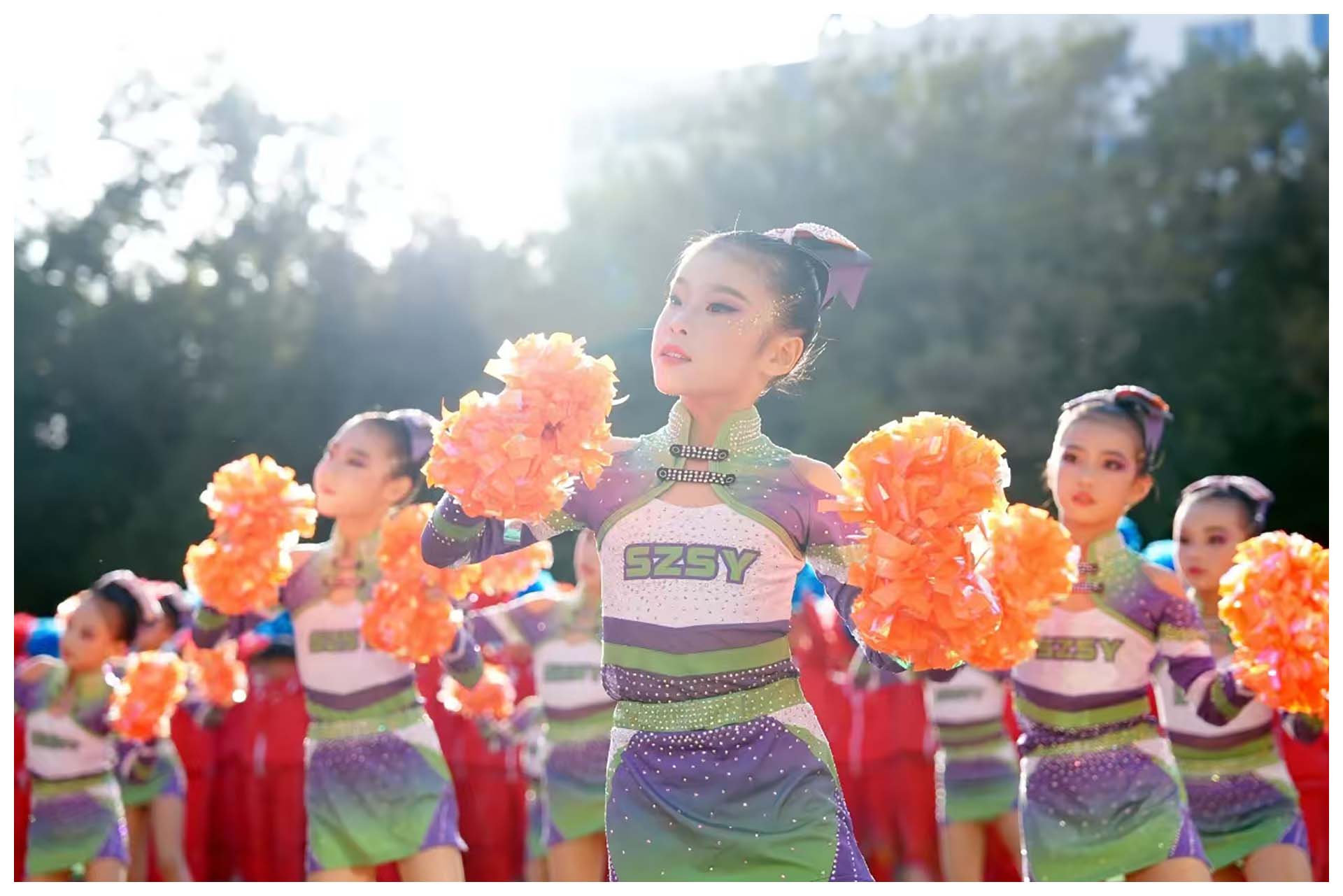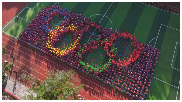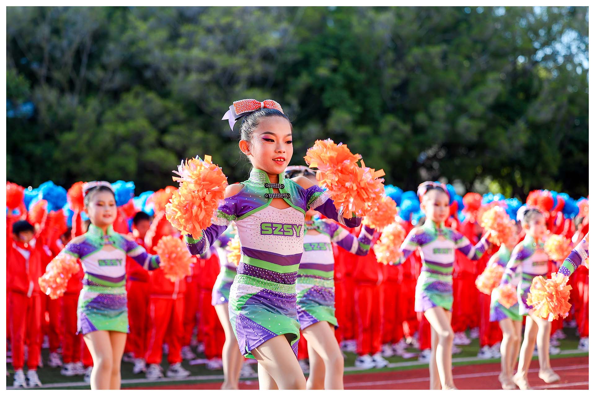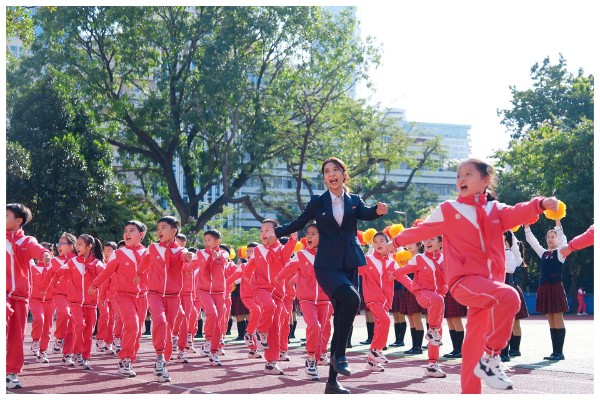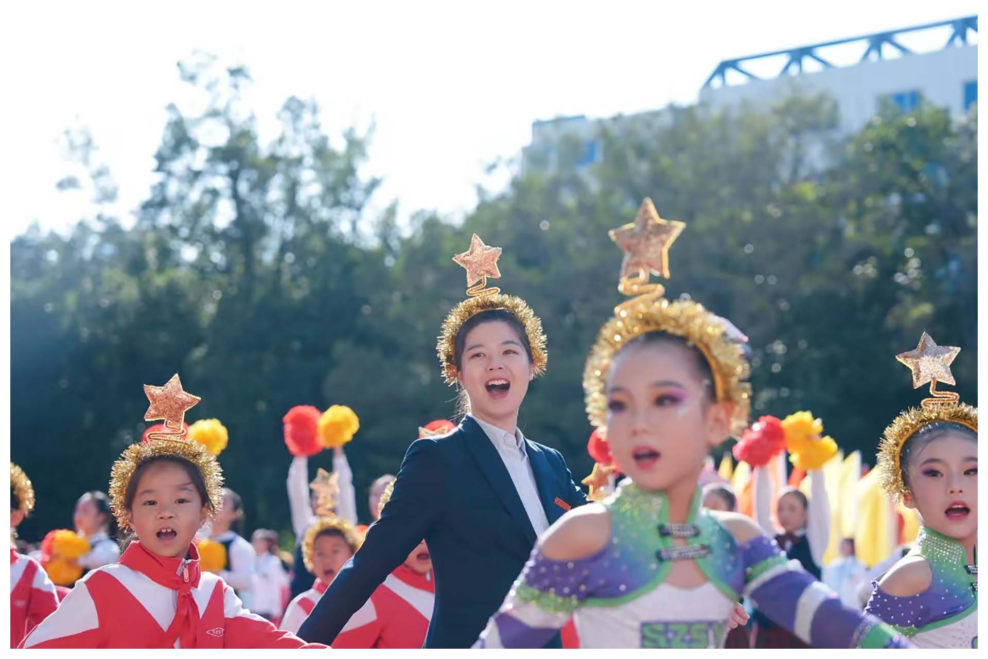紧随其后,二至五年级的同学们带来团体操《少年有志》,他们跟着激昂的旋律,舞动鲜艳的彩球,不断变换着队形——“SZSY”“奥运五环”……一个个特别的图案彰显着集体协作的魅力。