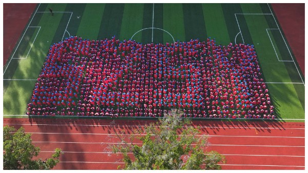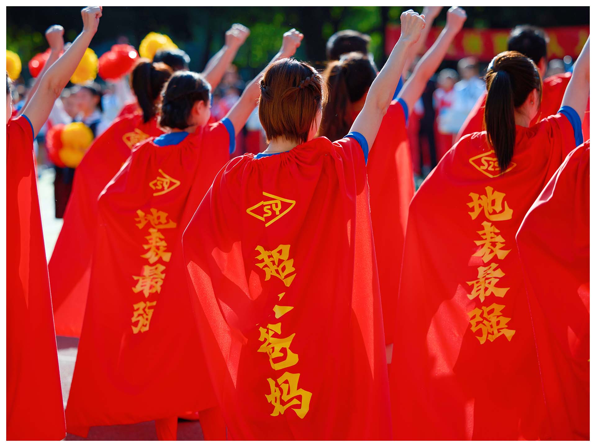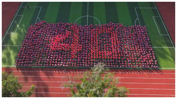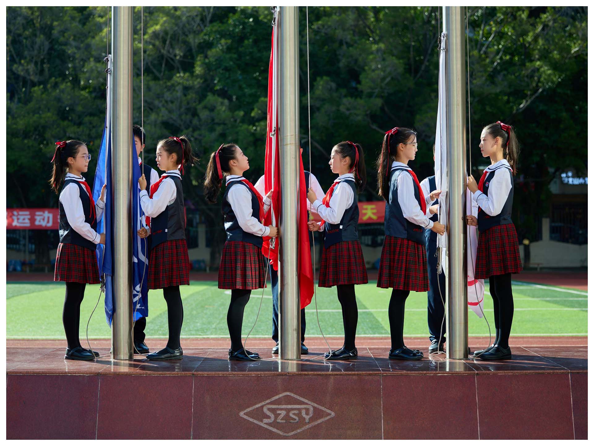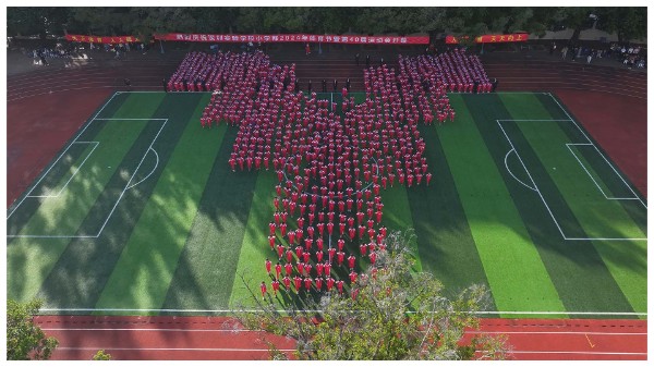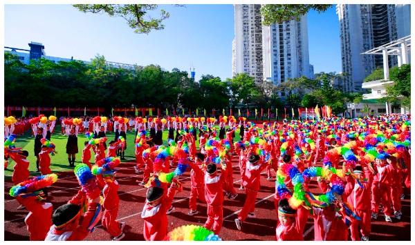 紧随其后,二至五年级的同学们带来团体操《少年有志》,他们跟着激昂的旋律,舞动鲜艳的彩球,不断变换着队形——“SZSY”“奥运五环”……一个个特别的图案彰显着集体协作的魅力。