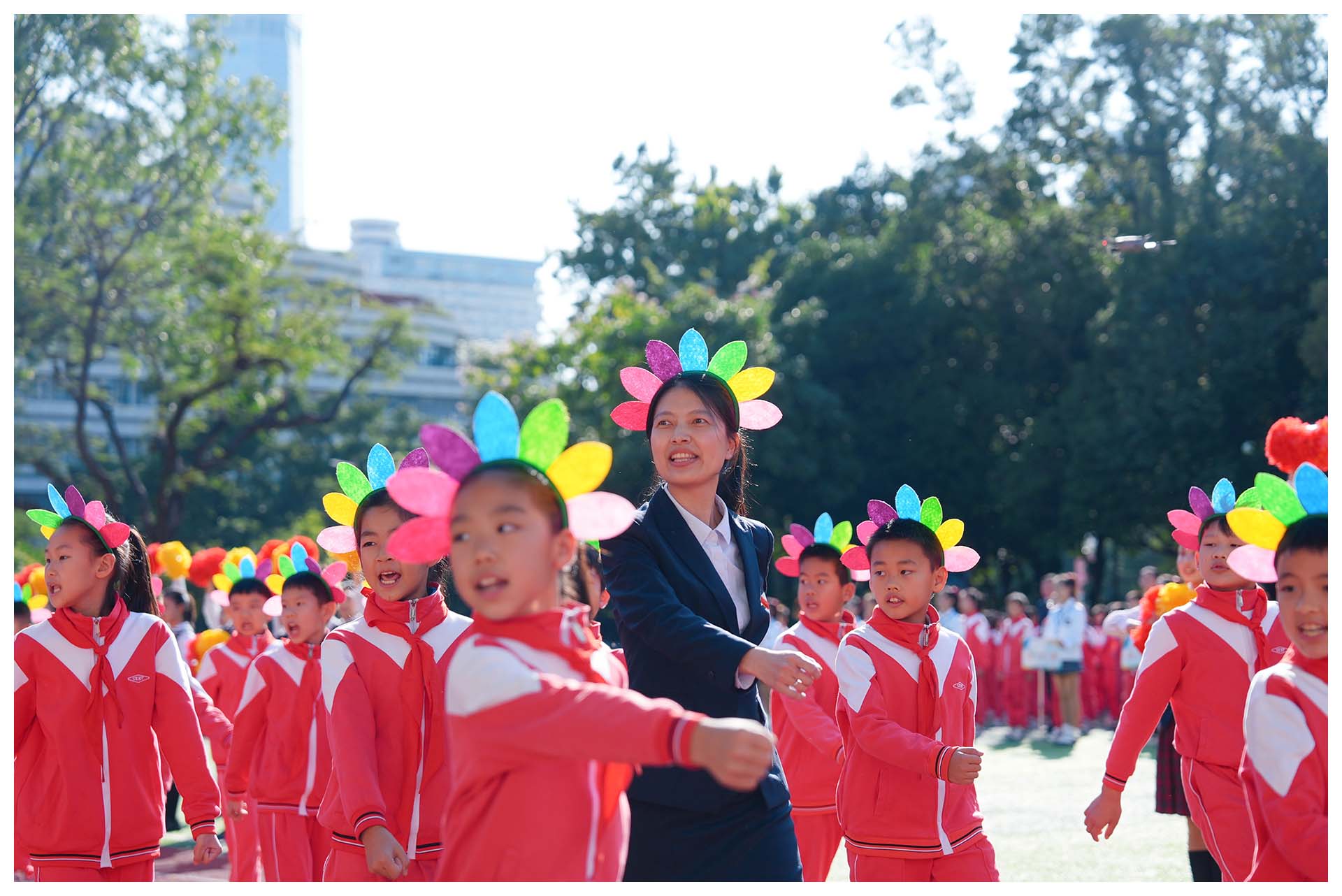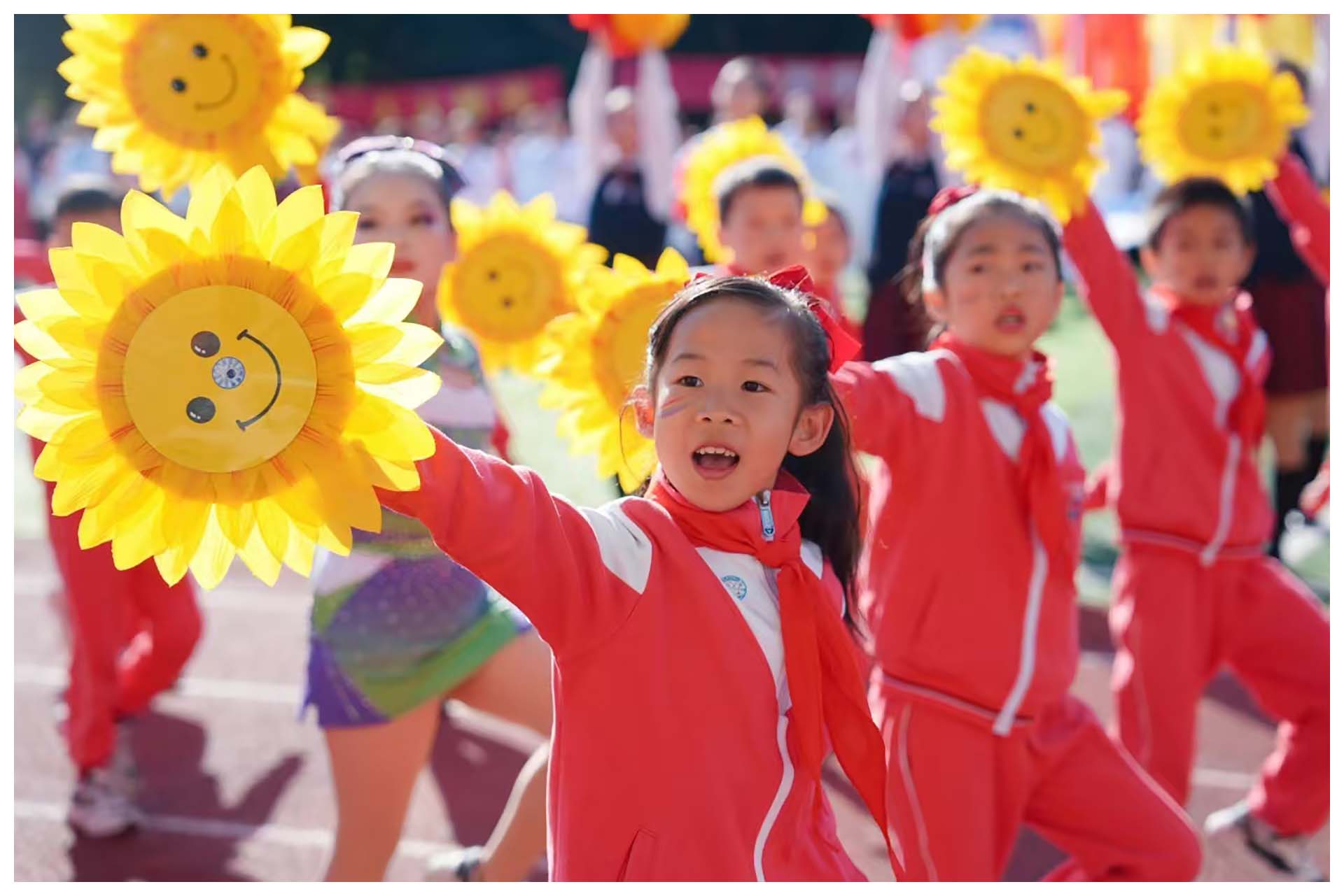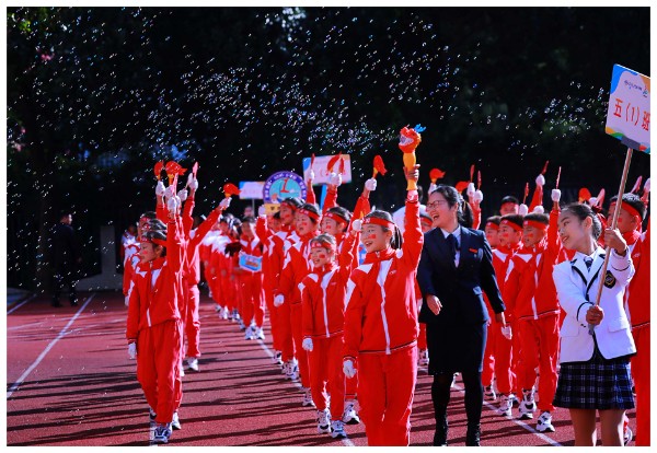 顿时,礼花齐放,将开幕式推向了最高潮。一年级的小朋友们欢呼着跑过主席台,他们手持彩圈,活力满满,如同初升的太阳。