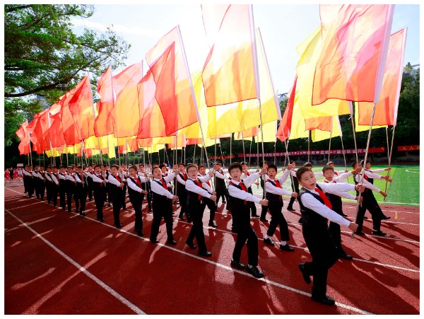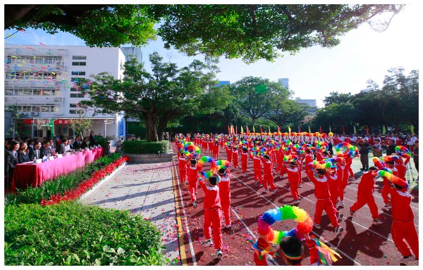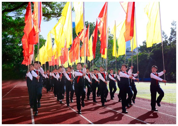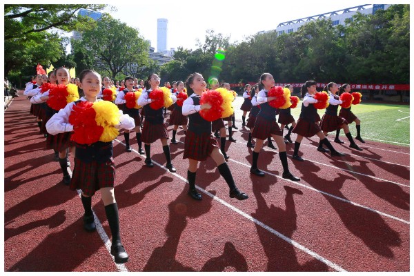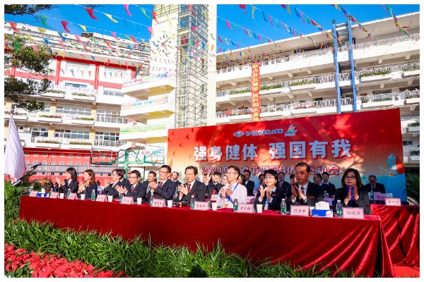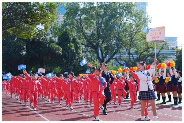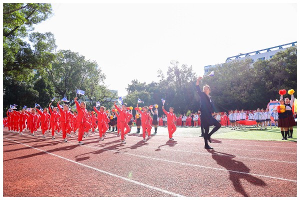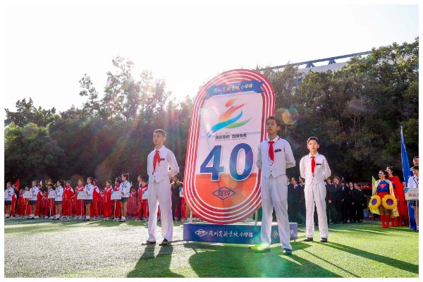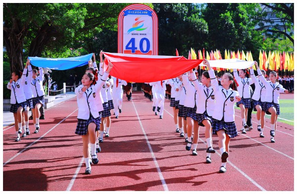四声浑厚悠扬的钟声回荡在校园上空,仿佛在诉说着实验学校四十年的辉煌历程和坚韧不拔的精神。随后,深圳实验学校党委书记夏育华宣布运动会正式开幕。