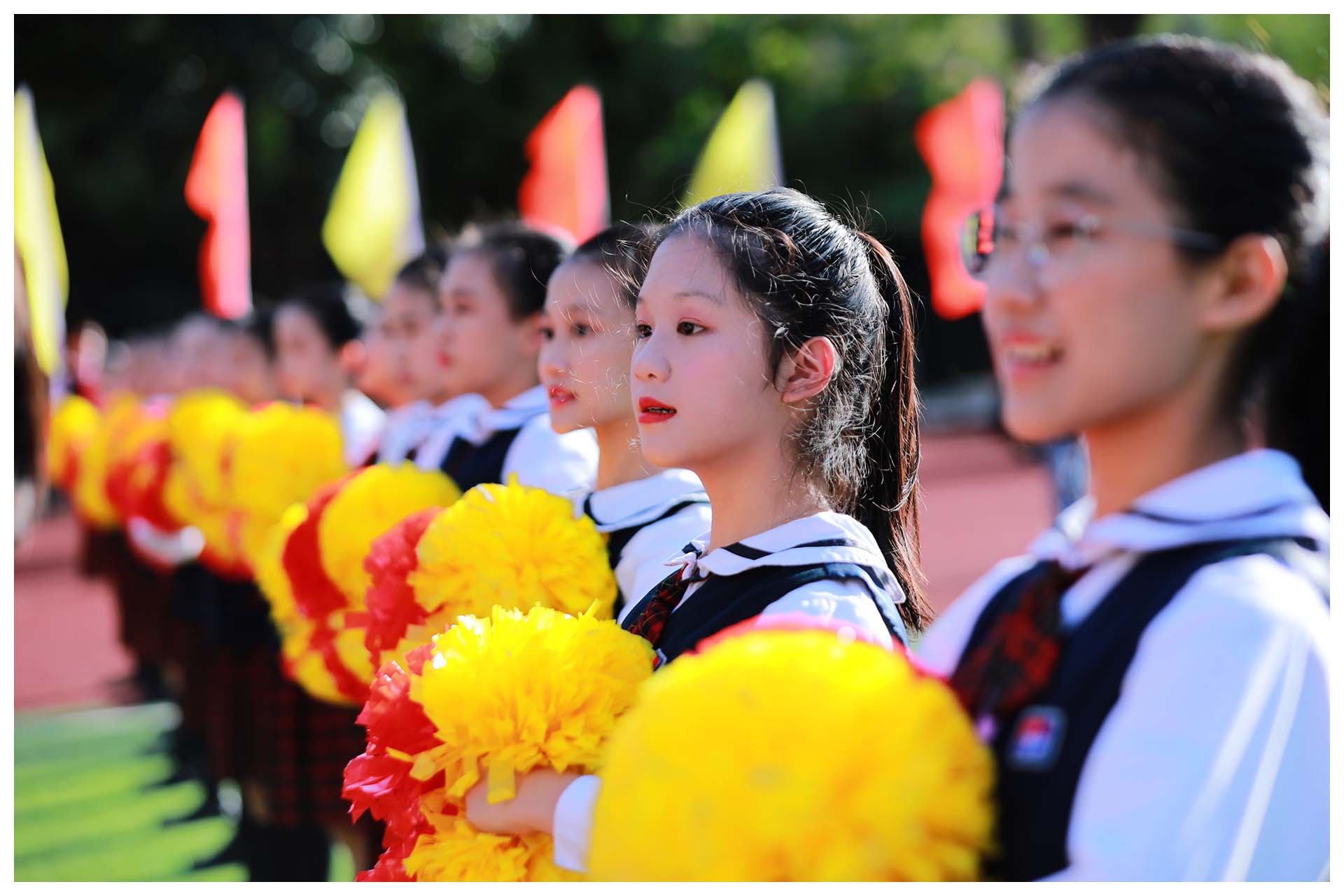 紧随其后的是由六年级女生组成的花队,她们手持红、黄花球,笑容满面,如同灿烂的花朵,散发着勃勃生机。