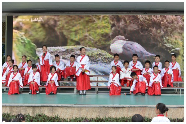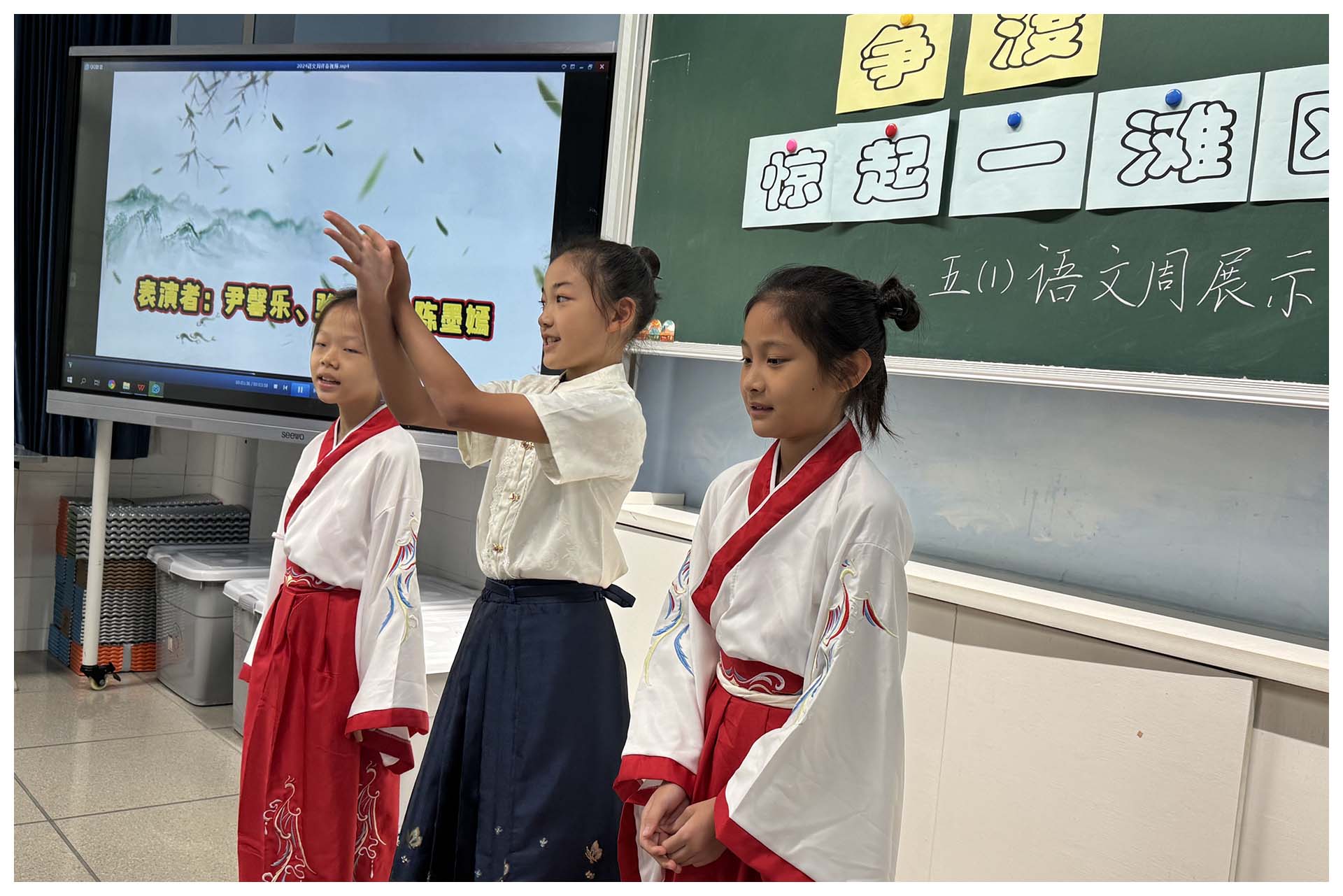 10月21日,备受瞩目的语文周开幕式拉开帷幕,一、三、五年级的孩子们如春日繁花般绽放在舞台上,用各具特色的古诗词诵读表演,将浓厚的古典诗文氛围渲染至整个校园。