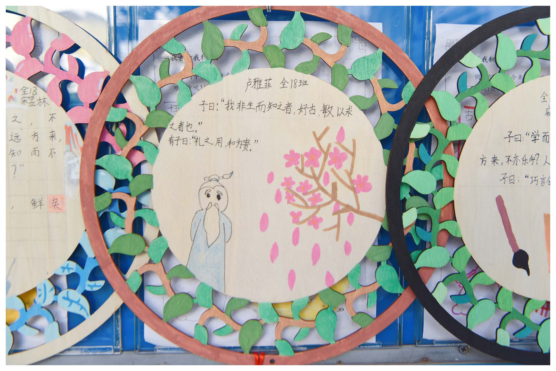 本次语文周,三年级开展了“童声诵《论语》”班级比赛和“文墨书论语”木挂画绘制两项活动。这两项活动如两颗璀璨明珠,闪耀着智慧的光芒。