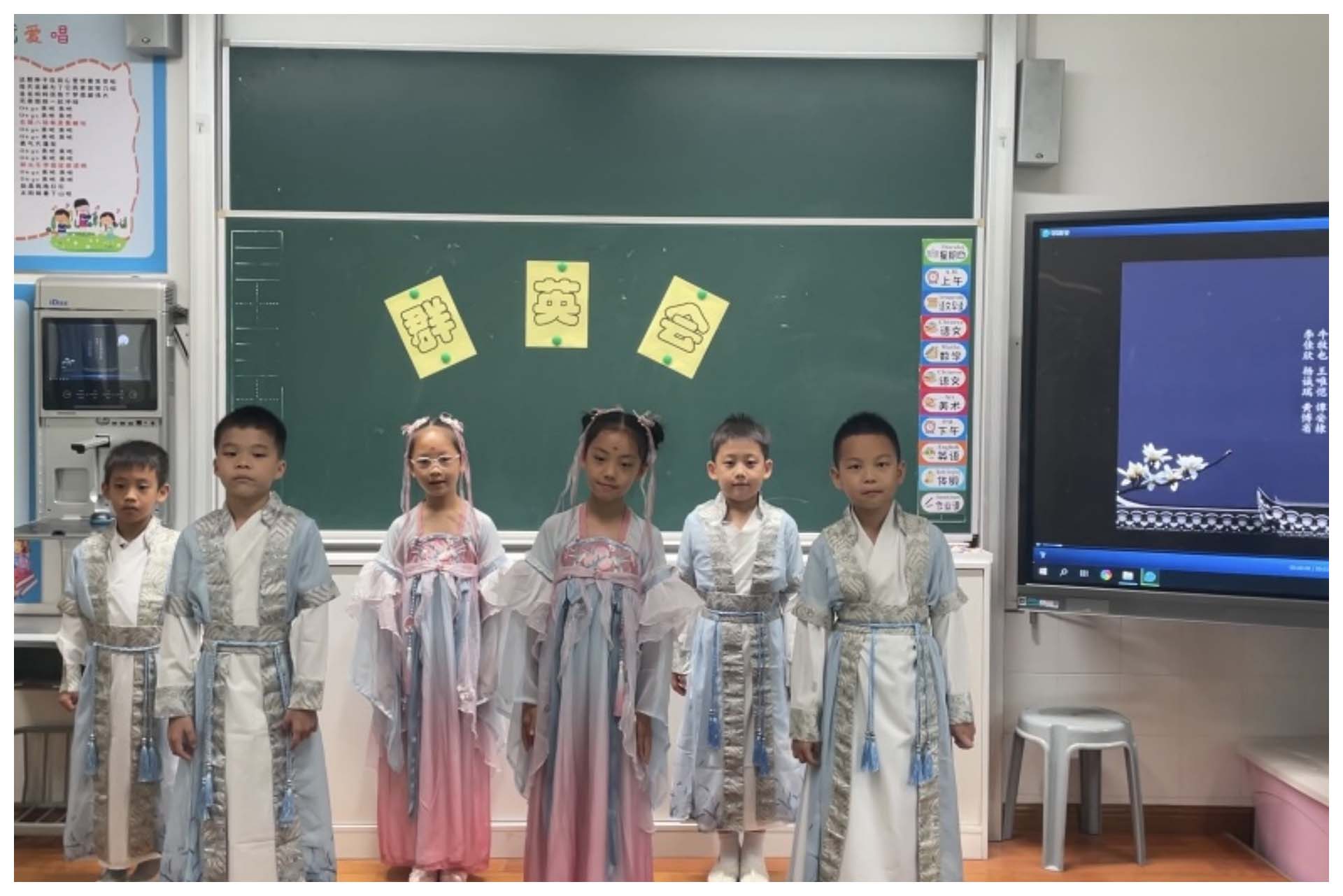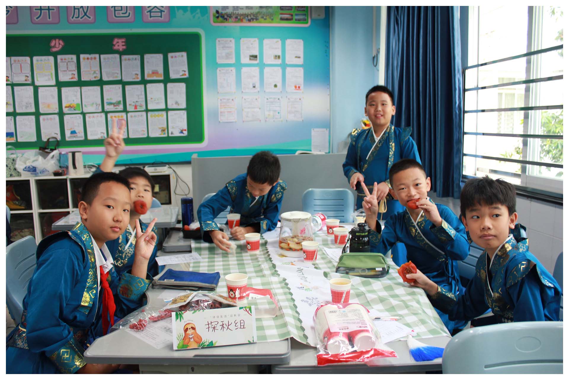 四年级的小诗人们身着古色古香的服饰,宛如从历史画卷中走来。他们围坐一起,学泡菊花茶,品尝柿子饼,在诵读秋天的古诗词中,探寻霜降的气候特点和习俗,走进有关秋天的故事。