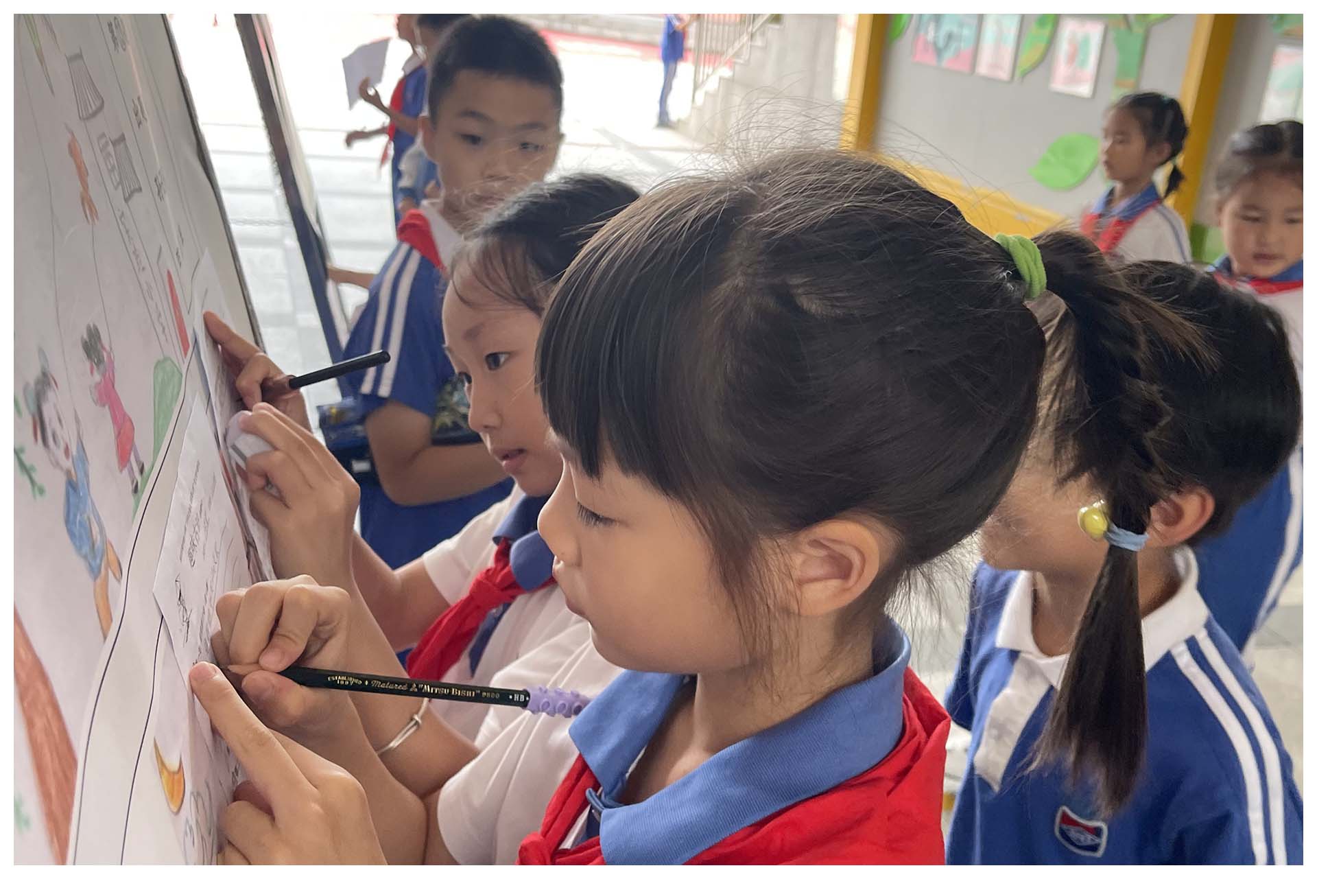 尤为令人赞叹的是,每一道考题皆出自六年级学长之手。除了开幕式现场用于抢答的题目,还有很多考题精心喷绘在告示板上,排列于校园黄墙一侧,宛如知识的画卷。全校同学人手一张答题纸,在语文周期间,孩子们将自己对诗意的理解化作笔墨,写在答题纸上,投入黄墙旁的收集箱内。闭幕式时,幸运答题者将从中诞生,收获一份充满惊喜的礼物。
