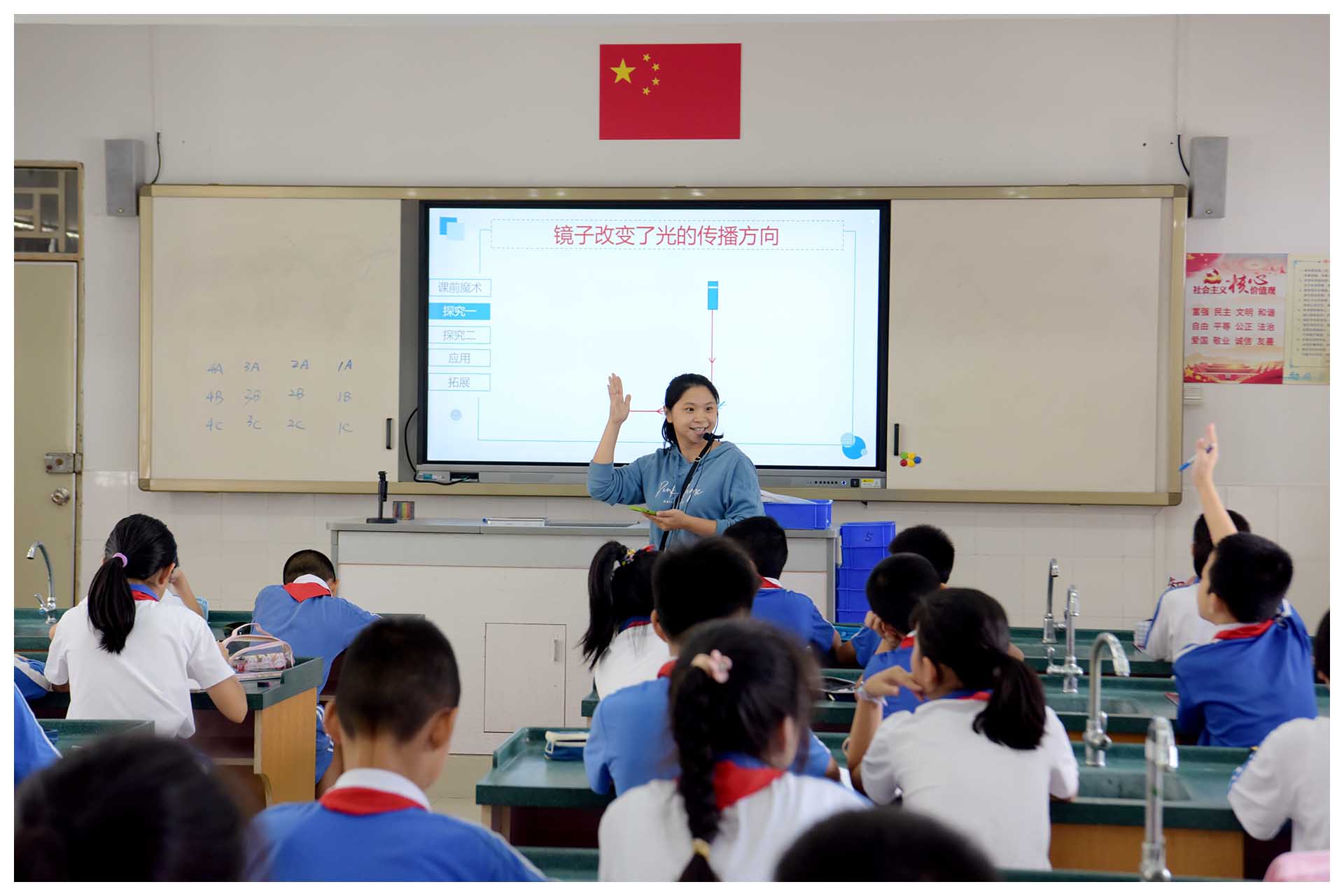 邓校长十分关注青年教师成长。上午,邓校与小学部干部一起走进科学组青年教师王妍琳老师的课堂,听了《光的反射现象》一课。王老师通过一个让硬币消失的小魔术,激发出学生的强烈的学习欲望,聚焦光的反射现象;接着,通过探究活动一“激光打靶游戏”,让学生感知光的反射有一定的规律,并继续辅助实验演示,深入理解入射光的反射规律;再通过探究活动二“不同颜色纸张对光的反射”,帮助学生理解物体呈现不同的颜色,是因为它们反射不同颜色的光进入了我们的眼睛;最后,通过一个生活小发明,感受学习科学的价值。在此过程中,王老师还应用了鸿合多屏互动软件,直播了学生的实验现场和实验记录,促进学生之间相互学习。学生学习兴趣浓厚,积极思考,不断提出新的问题,多次将课堂推向高潮。