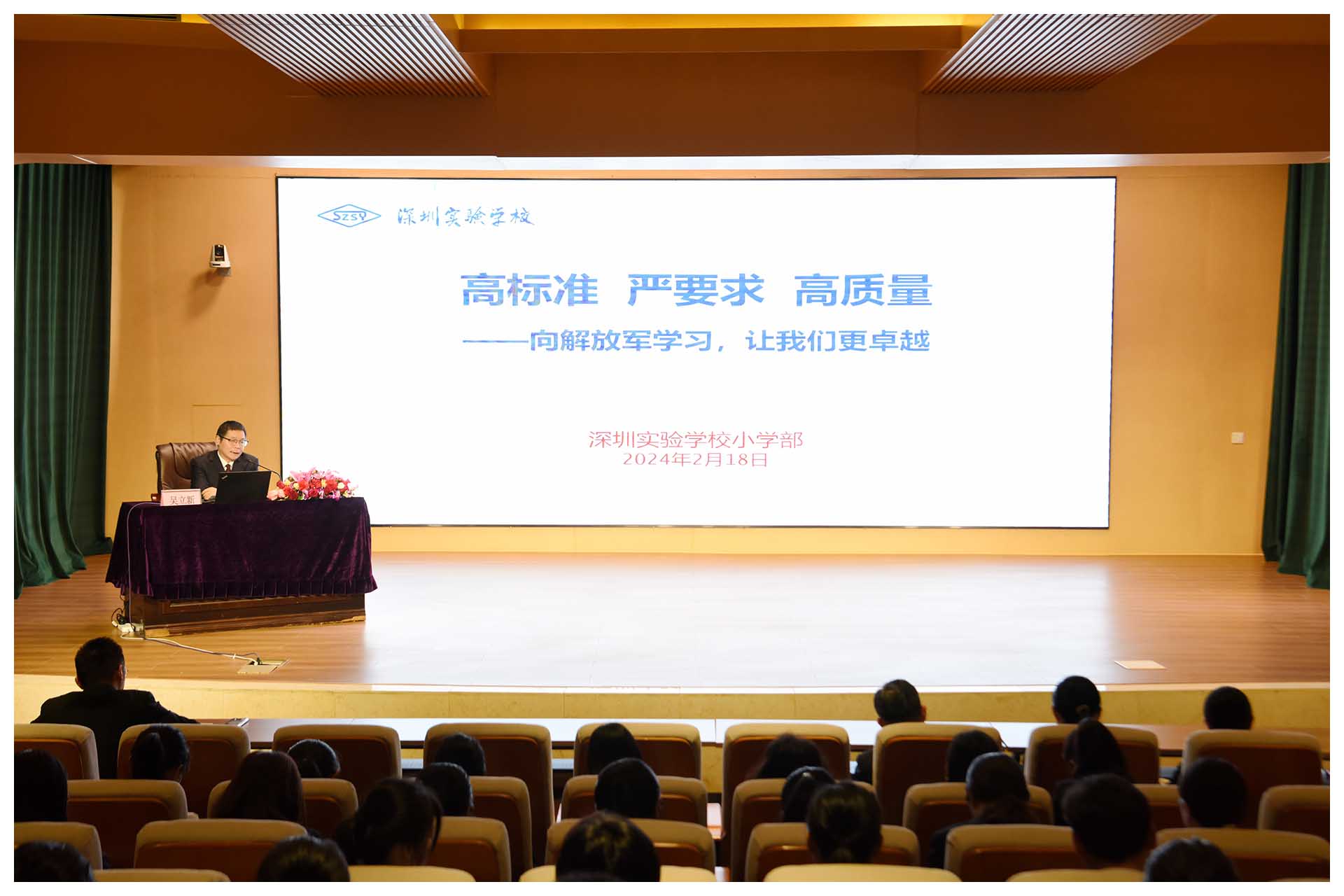 2024年2月18日上午,小学部在报告厅举行2023-2024学年度春季学期教工大会,深圳实验学校副校长、党委委员,小学部党支部书记、执行校长吴立新转达了集团党委夏育华书记和邓旭校长对全体教工的新春问候,并以“高标准、严要求、高质量”为主题,发出了“向解放军学习,让我们更卓越”的号召,提出了新学期的新要求与新期望。