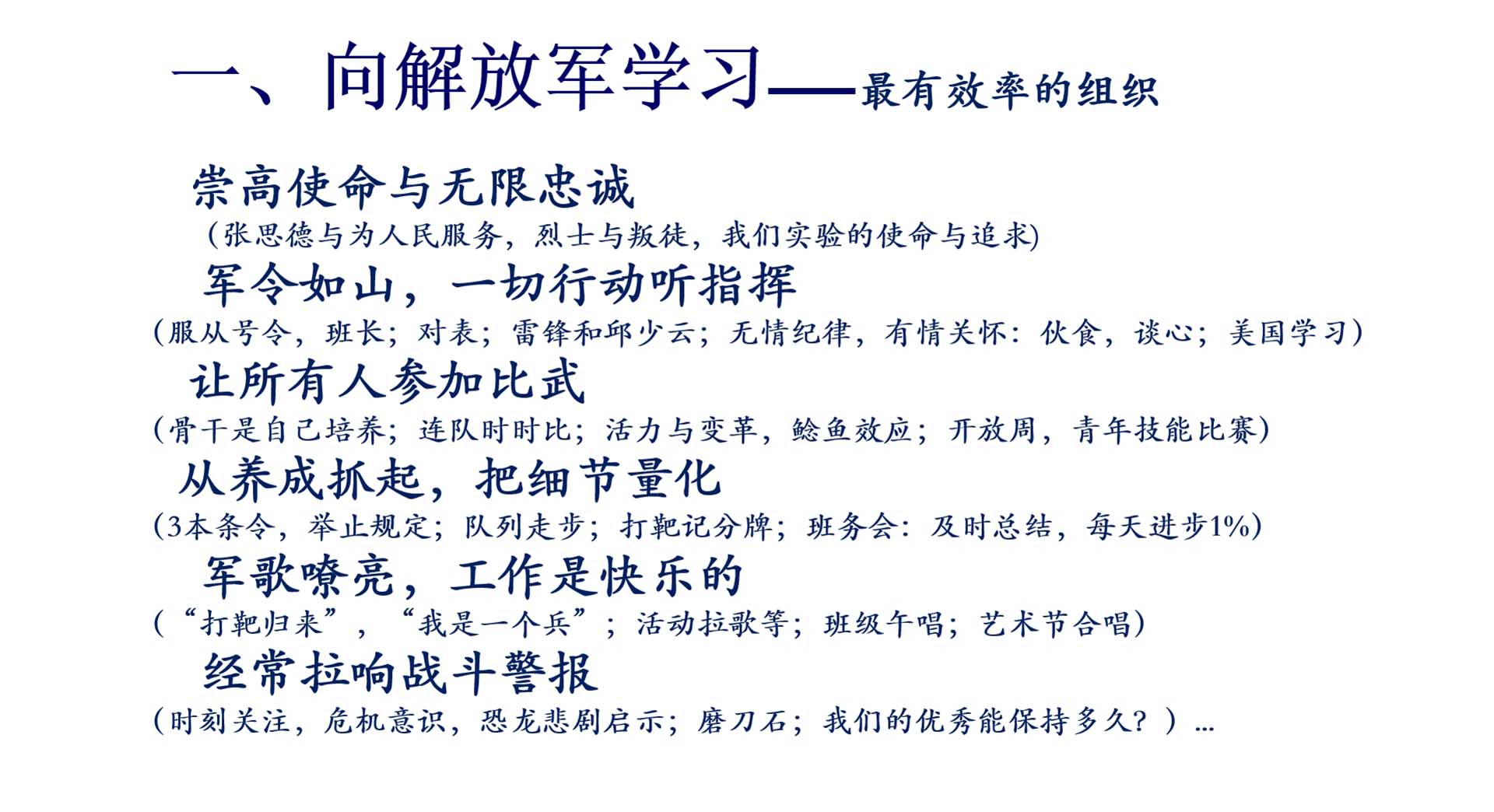 吴立新校长首先回顾了共产党领导下的人民解放军九十多年来的光辉历程,对小学部教工团队提出期许,要成为最有效率最为成功的组织,号召教职工要向解放军学习。一是要学习解放军肩负崇高使命与无限忠诚。我们实验教师应有努力成为中华民族脊梁的追求,忠诚于我们选择的教育事业。二是要学习解放军军令如山。无情纪律,有情关怀,我们实验人应团结奋斗,以更高效的执行力,不断创造新辉煌。三是要学习解放军全员比武。本学期的校区同课异构展示、教学开放周、青年技能比赛、各项教研活动,都是在培养我们实验自己的骨干。四是学习解放军从养成抓起,把细节量化。在育人工作中,我们要及时总结,持续推进工作,每天进步一点点,保持敬业,创新,严谨,精深的教风。五是要学习解放军军歌嘹亮。教育生活中,歌声,笑声,读书声和运动声,保持快乐的工作情绪,拥有生生不息的活力,努力创美好师生生活,办人民满意的教育。六是要学习解放军经常拉响战斗警报。我们应当有底线思维,要有危机意识,在追求卓越的进程中,励精图治,不断进取,永不满足。