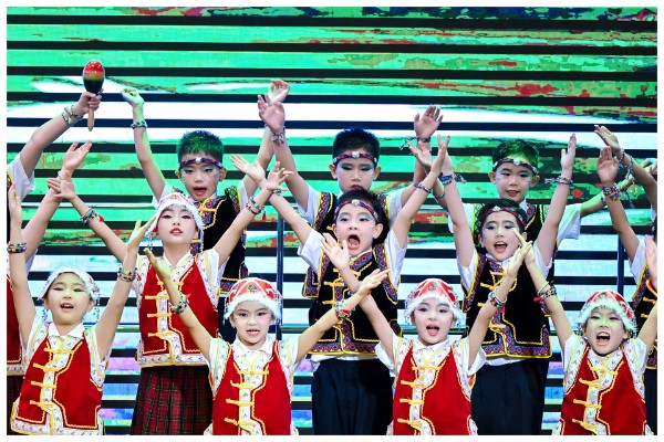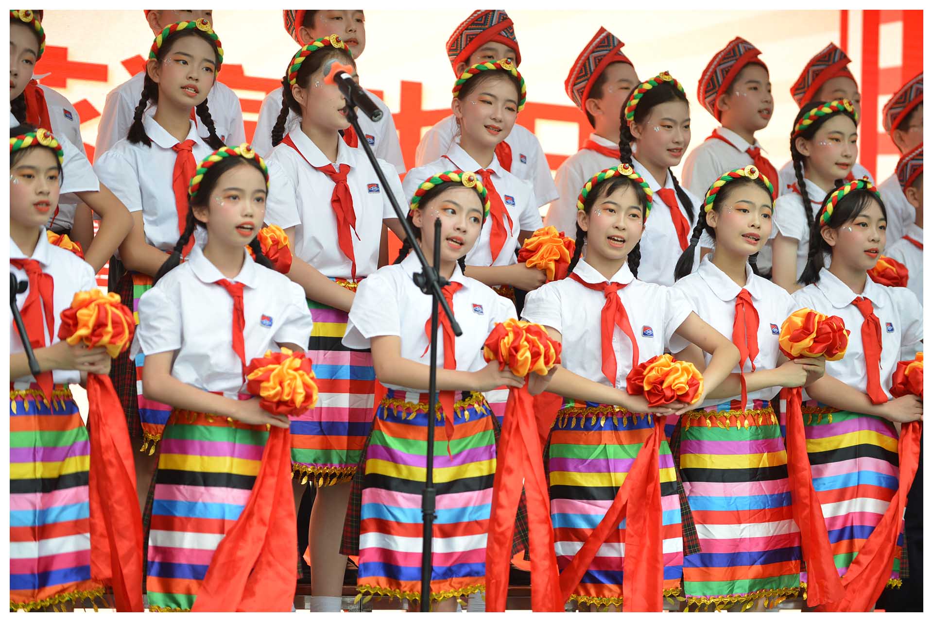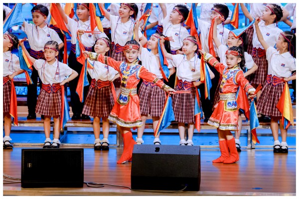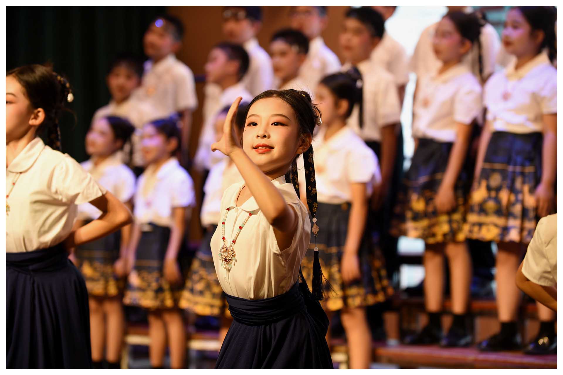 一年级的小朋友以生动可爱的舞台表现赢得场上满满的赞誉。草原里的小马驹、红军里的小战士、民族解放的歌咏者,稚嫩的童声搭配可爱的动作,令人眼前一亮。