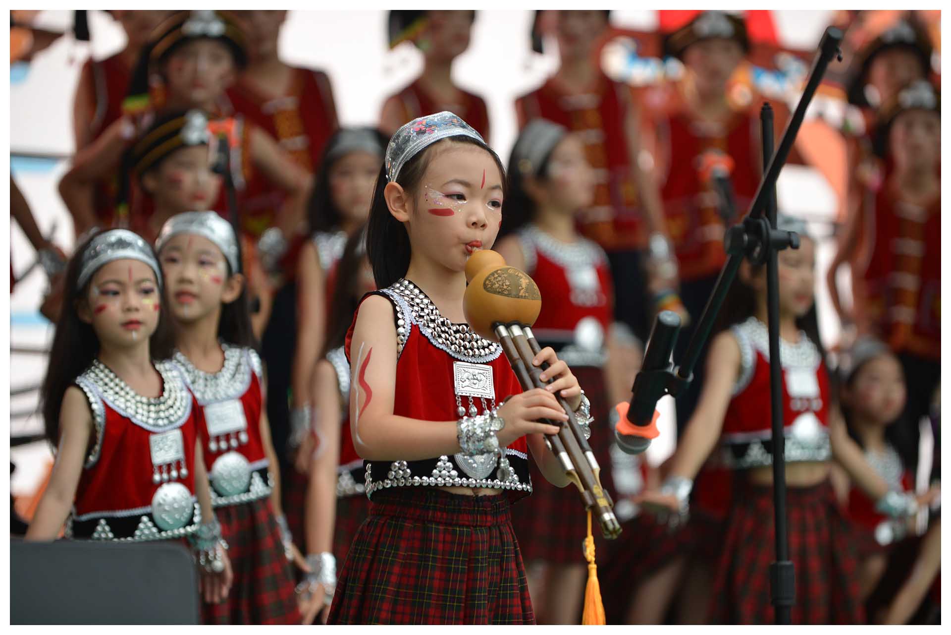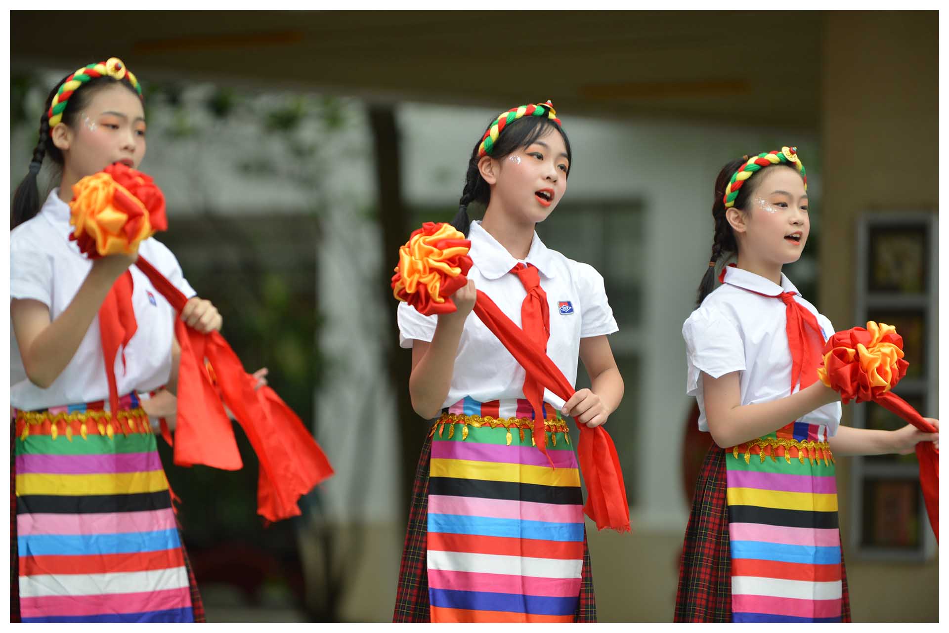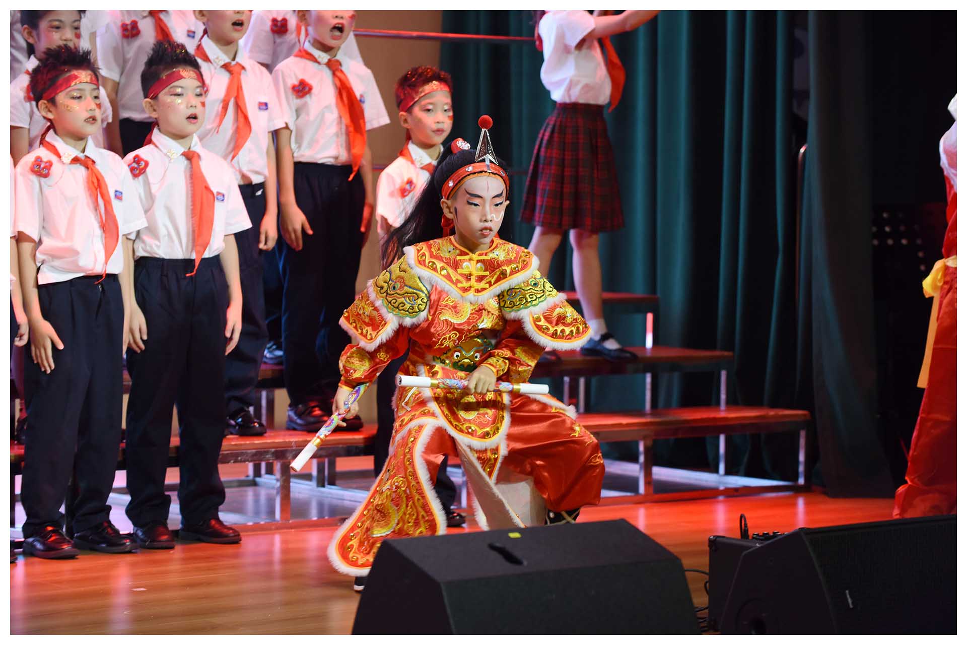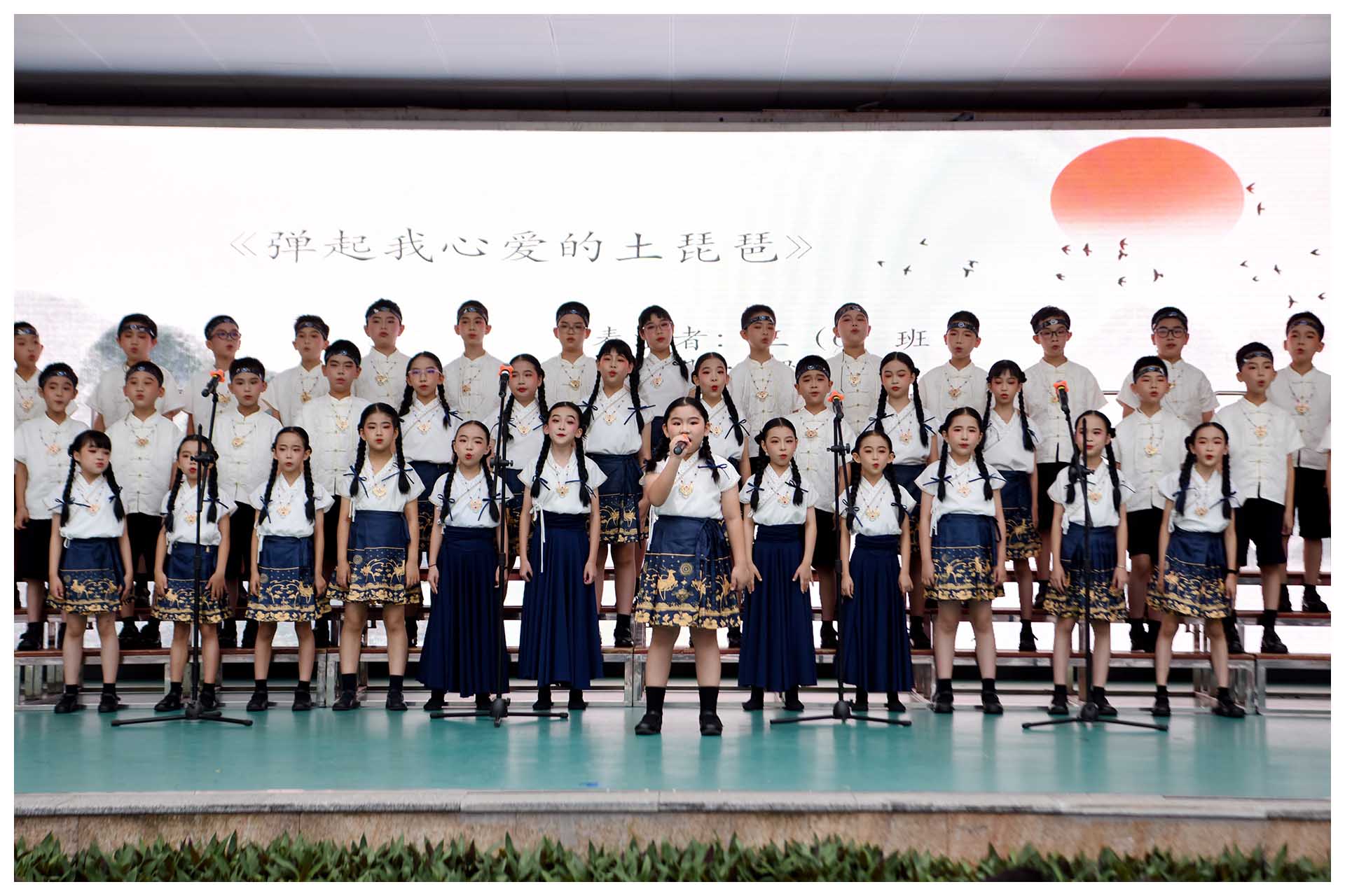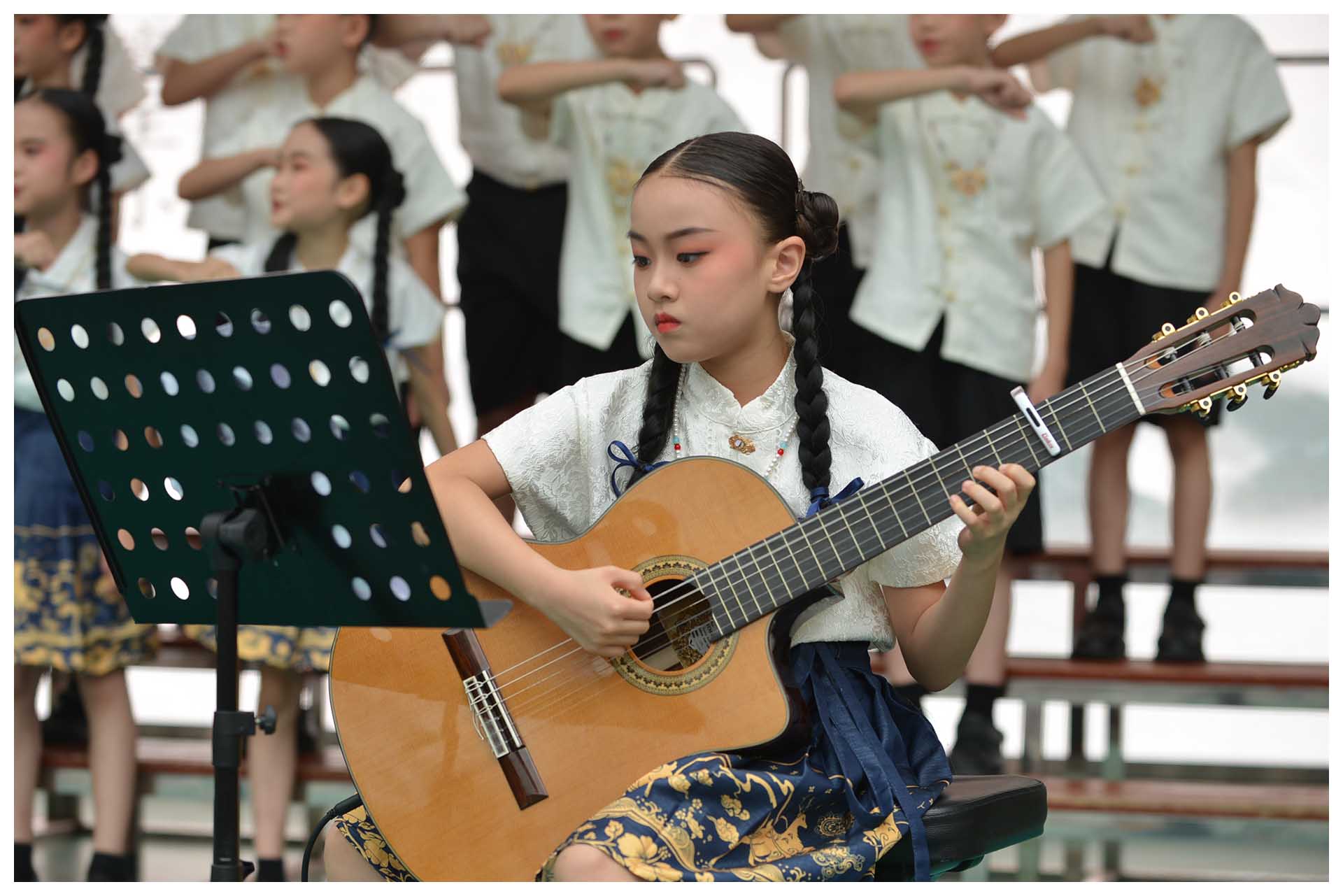 《浏阳河》、《弹起我心爱的土琵琶》等一首首极具代表性的红歌拉开了三年级专场的帷幕,歌曲中融合了民俗英歌舞与中国鼓、吉他与舞蹈等不同的组合形式,让我们耳目一新。