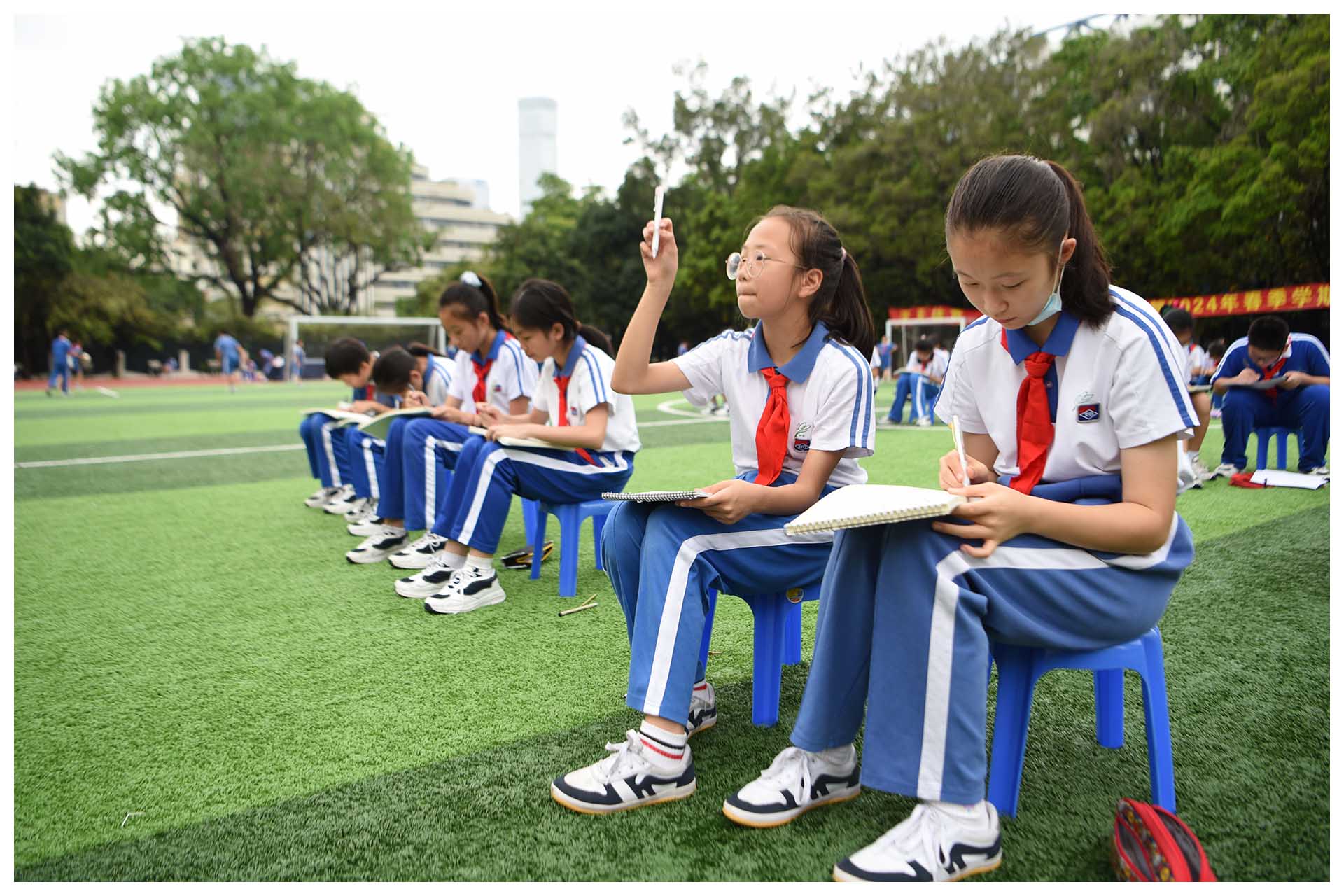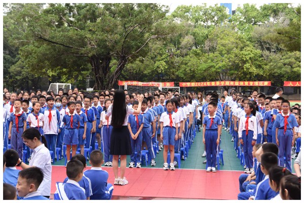最激动人心的“拉歌”环节到了。每个年级的同学们共唱一首歌曲,从一年级到六年级,或活泼可爱或意气风发,在开幕式上大展风采、各美其美。同学们歌声嘹亮、气势如虹,拉开了班级合唱比赛的序幕。