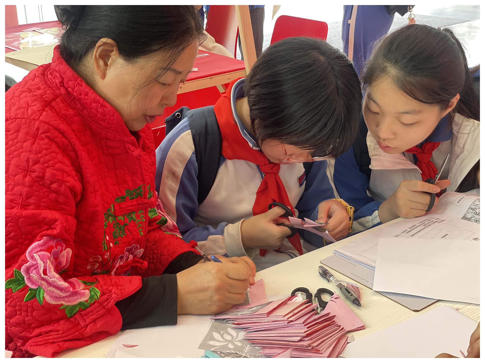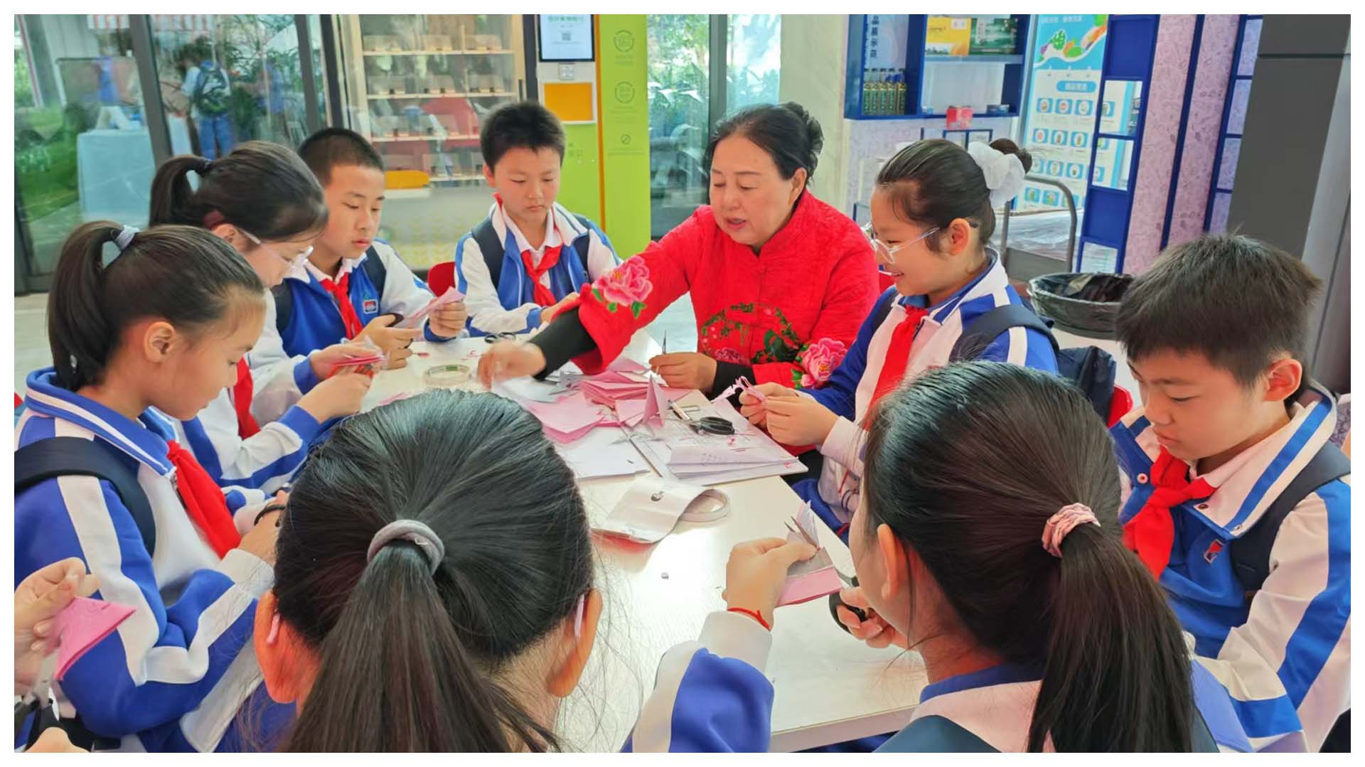 在这次半天外出实践活动中,非遗体验犹为精彩。我最印象深刻的项目是剪纸。随着一片片红纸落在地上,我和同学们尽情创造想象属于自己的独特图案。我们在耐心与专注中体会浓浓的中国味、中华情,感受华夏大地的永恒精神!