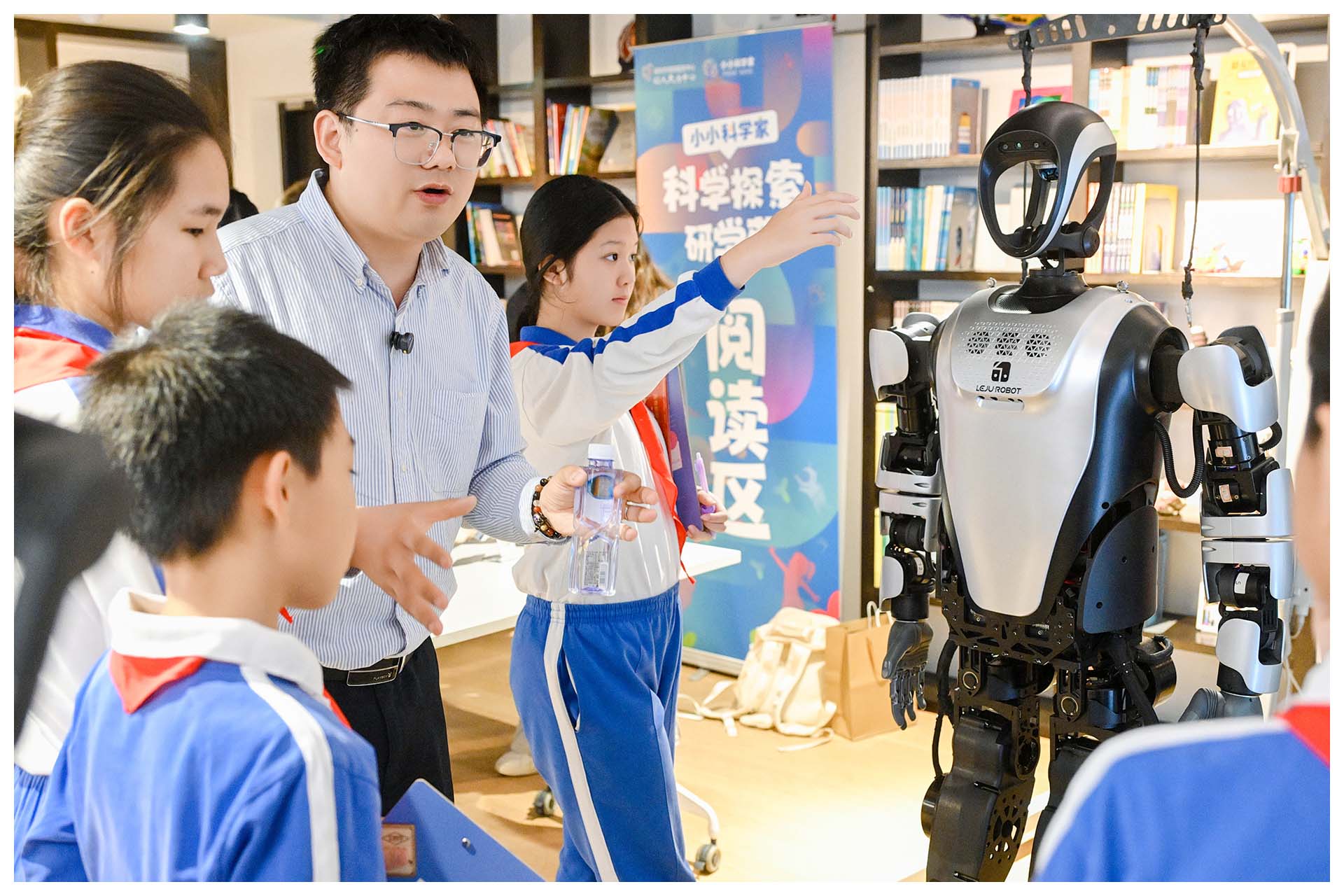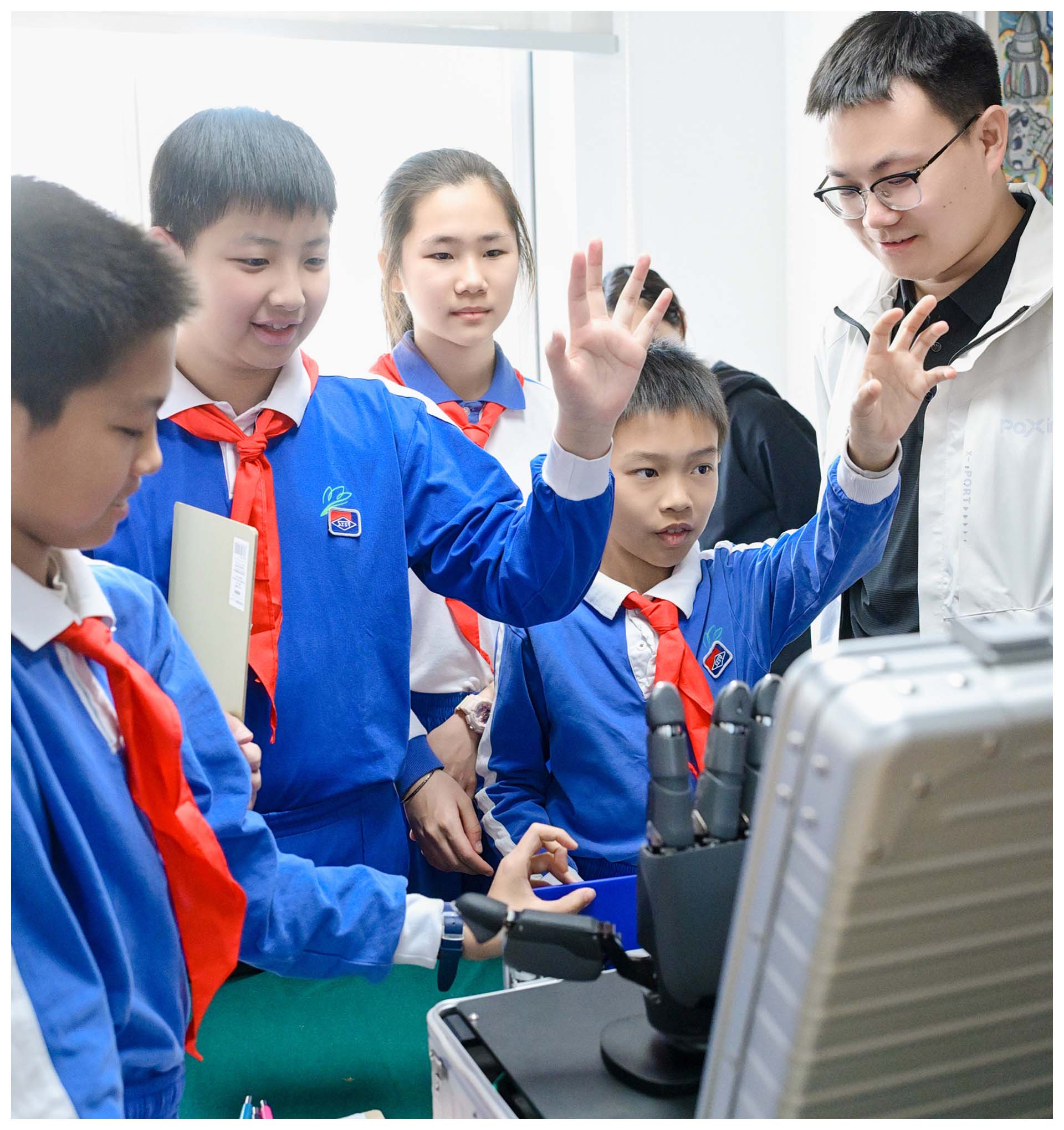 活动伊始,万斯未来老师以党史为切入点,巧妙导入,深入解读深圳精神,并带同学们回顾了深圳的发展史,为同学们开启科学探索之旅。随后,在习文老师和林倩如老师的指导下,同学们近距离接触各类前沿科技展品,面对如Xtool激光切割机展现出精密加工的魅力、优必选的机器人展现出灵动有趣的特性等,大家都不禁发出阵阵惊叹。有的同学紧紧围在激光切割机旁,眼睛一眨不眨地盯着切割过程,脸上满是好奇与专注;有的同学则兴奋地与机器人互动,尝试指挥机器人完成各种动作,欢声笑语回荡在整个体验区。众多科技企业的积极参与,为此次活动注入强大动力,让同学们能沉浸式感受科技魅力。最后,老师引导大家进行体验总结,并开展创意头脑风暴,进一步激发同学们对科技的热爱与探索热情。