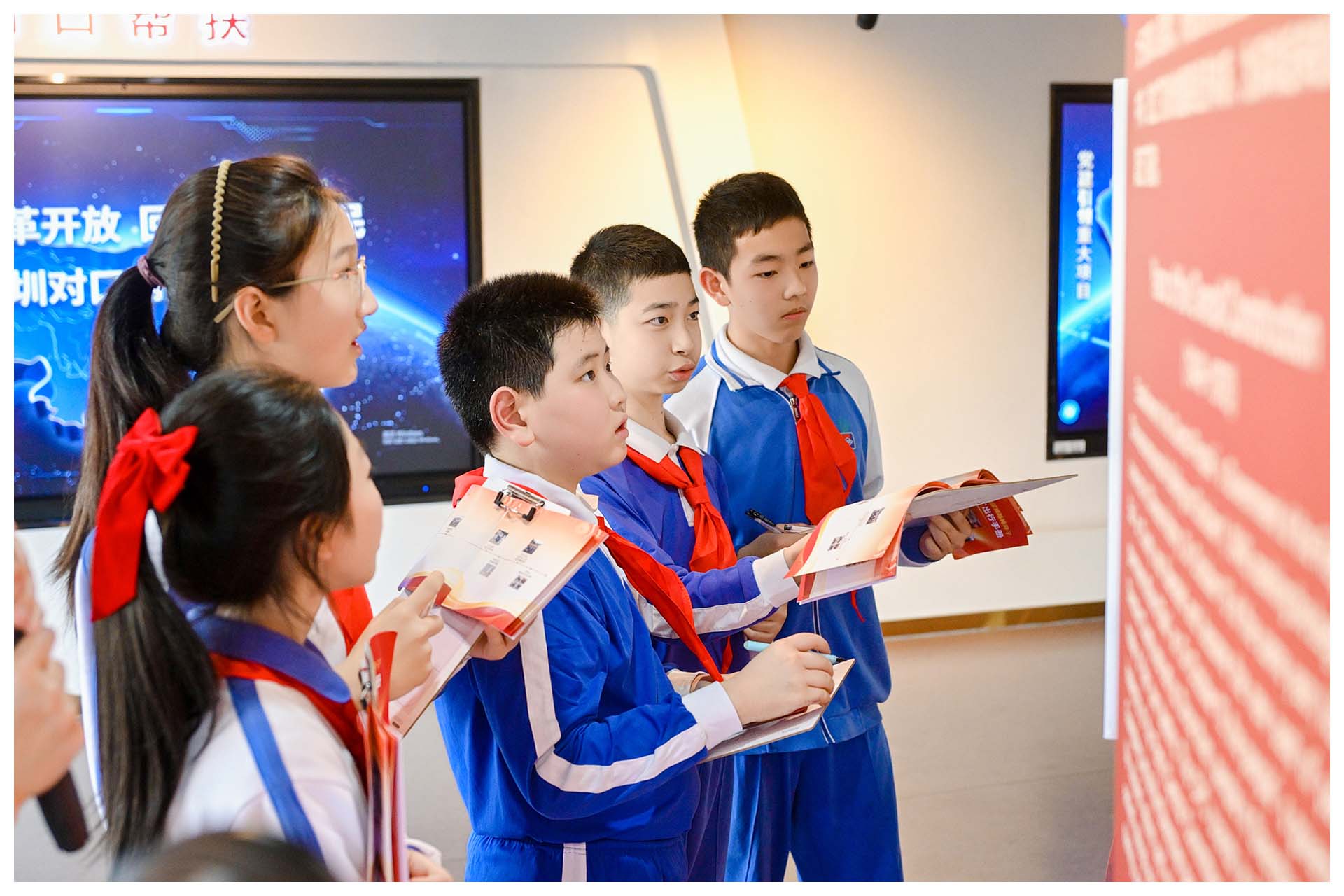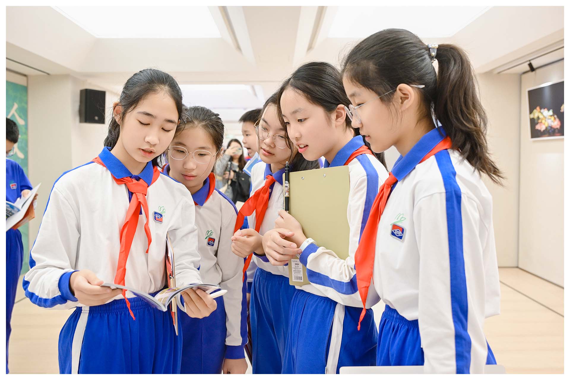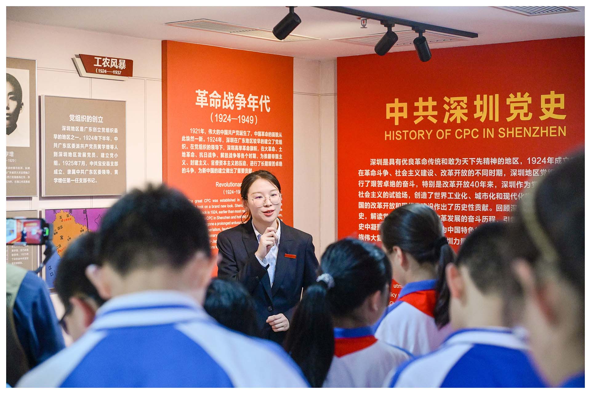 党史长廊内圈以红船精神为起点,按时间轴徐徐展开,依次呈现中共党史波澜壮阔的历程,以及深圳党组织在不同历史阶段的发展脉络与重要贡献。党群服务中心的讲解员和张雅茹老师分别为同学们进行了党史知识的讲解。不仅如此,现场还有学生代表分享他们在课前探究中积累的党史知识与感悟,从青少年视角为大家带来全新解读。通过这次党史学习,同学们对党的历史有了更全面、更深入的了解。