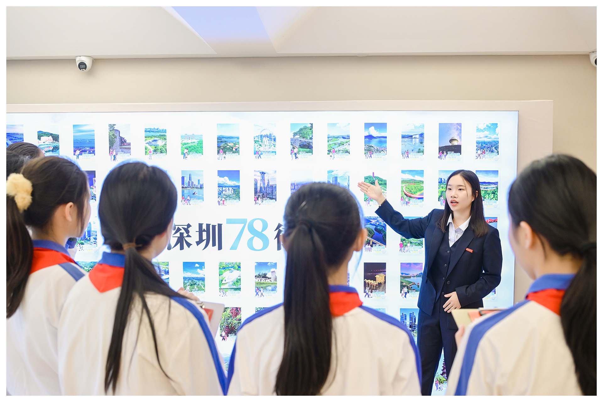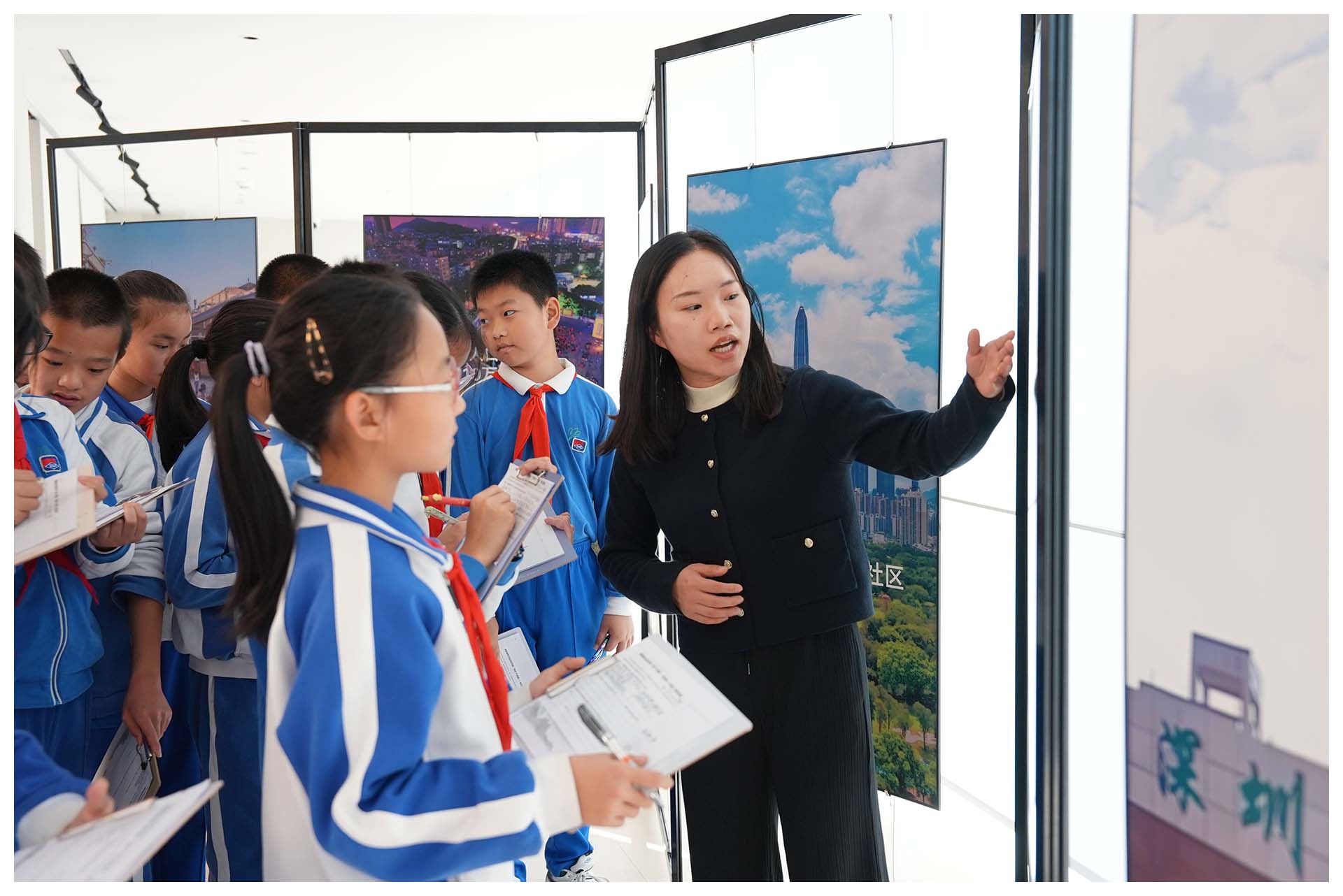 在百姓书房,同学们围绕在王梓颖老师身边,认真聆听深圳 78 个街道的发展历史与成就,感受另一个深圳。王梓颖老师通过一幅幅生动的照片、一组组具体的数据和一个个有趣的故事,为同学们勾勒出了深圳街道发展的清晰脉络。从改革开放初期的小渔村,到如今的国际化大都市,深圳的每一条街道都见证了这座城市的飞速发展。