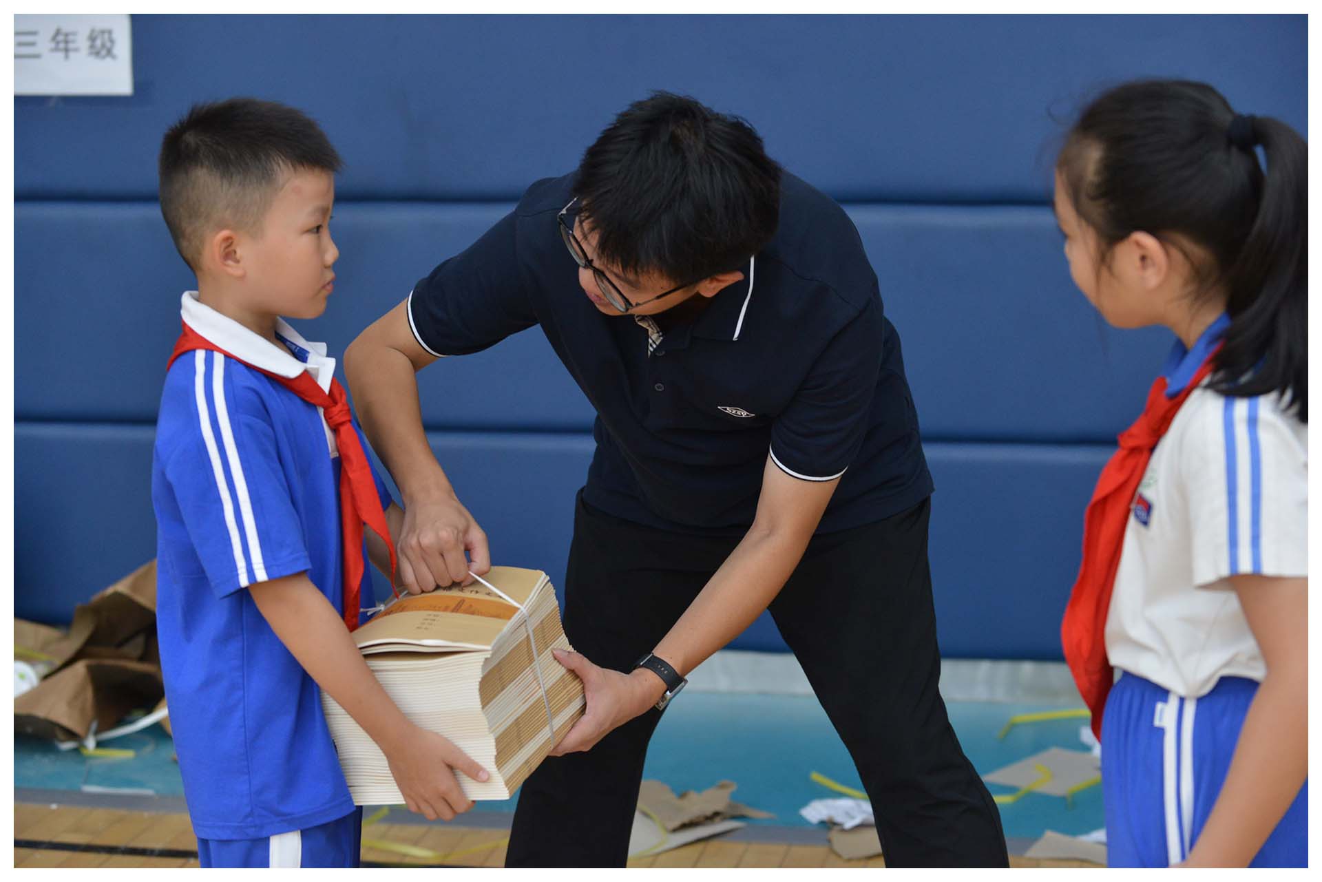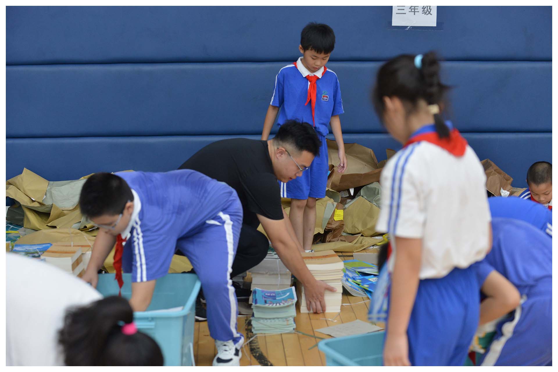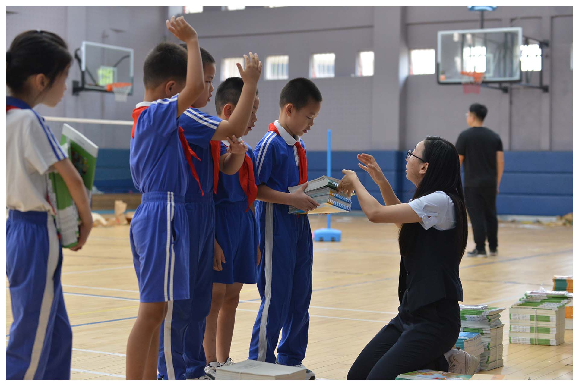早晨8时10分,校门口已洋溢着欢声笑语——高年级同学主动帮助低年级学弟学妹提书包,班主任们站在教室门口热情相迎,“好久不见,你长高啦!”“暑假去哪里玩了呀?”亲切的问候让校园充满温暖。各班有序开展学前教育,班主任组织学生收交假期作业、分享假期生活。二至六年级学生代表前往体育馆领取新教材,孩子们手捧崭新的书本,迫不及待地翻阅,轻声交流着新发现。
