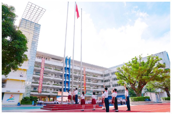 上午8时20分,以“让榜样之光,照见行动之路”为主题的开学典礼在一楼广场隆重举行。伴随着庄严的国歌,五星红旗冉冉升起,全体师生肃立行礼,目光坚定。仪式上,大家共同观看了深圳经济特区成立45周年宣传片《心向未来,逐光奔跑》。画面中呈现的深圳发展变迁,让孩子们深刻体会到“生在特区,长在特区”的骄傲与自豪。