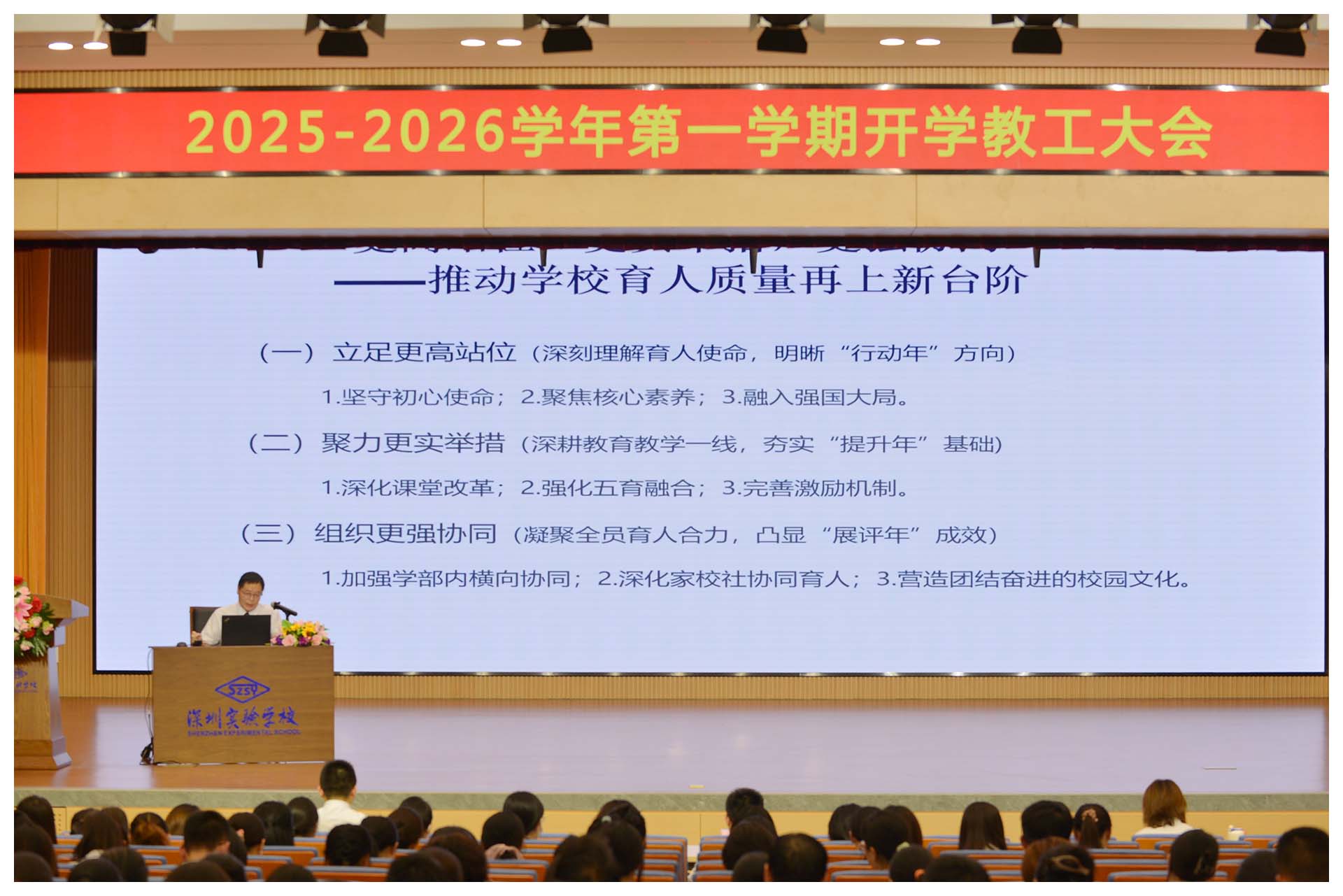 吴立新执行校长以“更高站位,更实举措,更强协同——推动学校育人质量再上新台阶”为题作主题讲座,明确本学期“行动年、提升年、展评年”的定位,从“立足更高站位坚守育人使命”“聚力更实举措深耕教学一线”“组织更强协同凝聚育人合力”三方面部署工作,提出学生在“向解放军学纪律、向奥运健儿学拼搏、向科学家学创新”的学习过程中强化行动养成,并公布“党建引领、队伍强本、校园焕新”等九大工程及分工,为新学期绘就清晰蓝图。