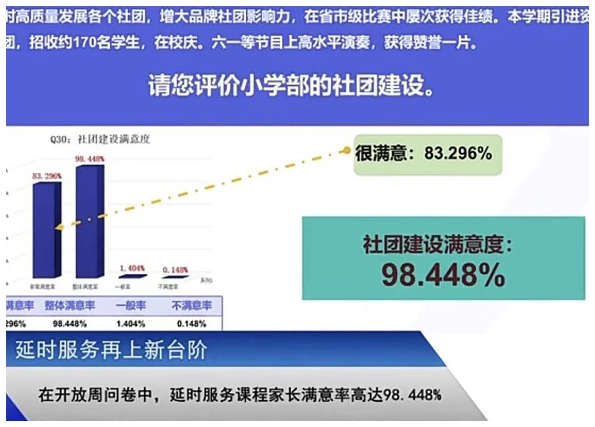 小学部创新课程,五育并举;赋能教师,精进专业,为“健全人格教育”深耕沃土,为打造教育家型教师夯基搭台。小学部坚持以“课堂为阵地”,潜心深耕,在“四秩芳华·智启未来”为主题的开放周中,家长对各学科课堂教学满意率高达98.314%,对小学部的办学满意率高达98.66%,延时服务课程家长的满意率也高达98.448%。本学期,小学部各类社团已达73个,可提供2175个社团学位,品牌交响乐团十多年后重新盛大开启。