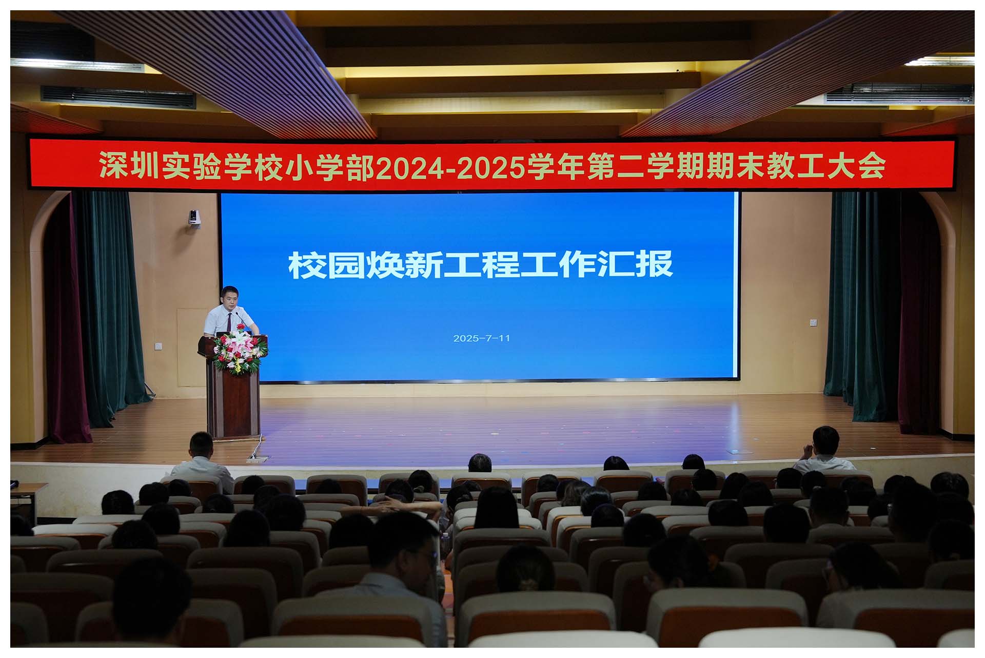 夏木苍翠,远山如碧。2025年7月11日,深圳实验学校小学部召开2024-2025学年第二学期期末教工大会。小学部全体教工与各班家长代表齐聚一堂,以“四秩励精图治路 群英奋楫向新程”为主题,回望总结了学校在教育教学、团队建设、家校合作等方面的教育历程。