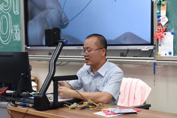 与此同时,旁边的美术教室里,黎兵老师指导的非遗草编社团正用草木编织着时光,引来领导和嘉宾们的一致称许。花鸟鱼虫的绿意与珐琅徽章的星芒交相辉映,共同织就实验美育的经纬长卷。